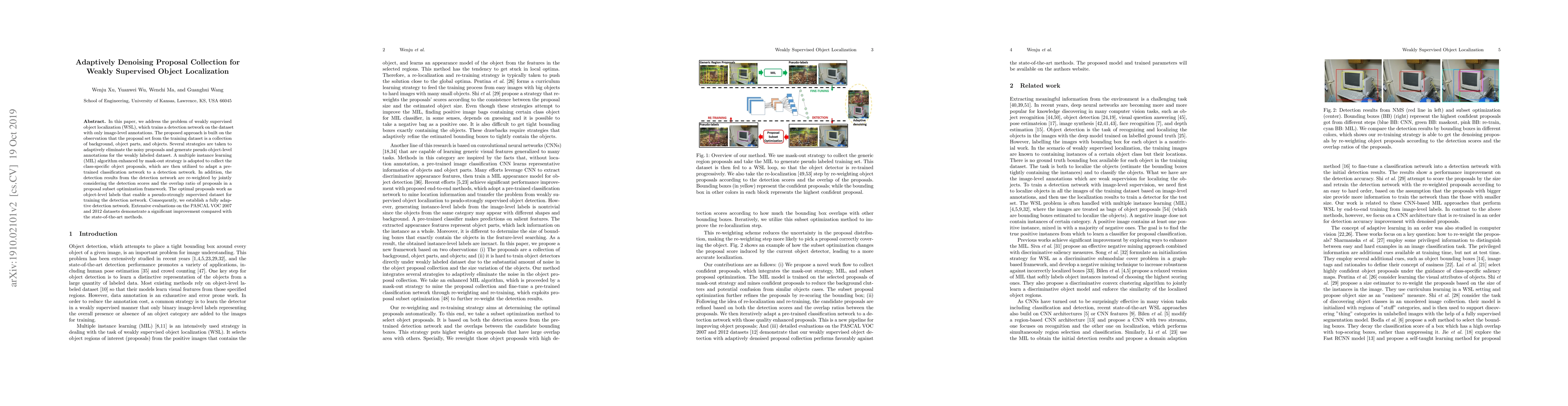 This paper proposes an adaptively denoising method for weakly supervised object localization, utilizing a multiple instance learning algorithm to refine proposal collections and generate pseudo object-level annotations, ultimately improving detection network performance on PASCAL VOC datasets. The approach effectively eliminates noise and optimizes proposal subsets to enhance localization accuracy.