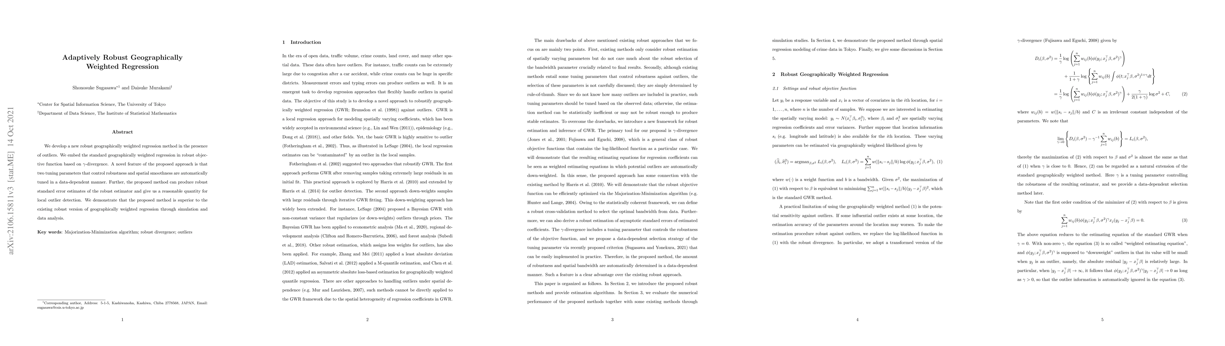 This paper introduces a novel adaptively robust geographically weighted regression method that automatically tunes parameters for robustness and spatial smoothness. It outperforms existing methods by providing robust standard error estimates and effective local outlier detection.