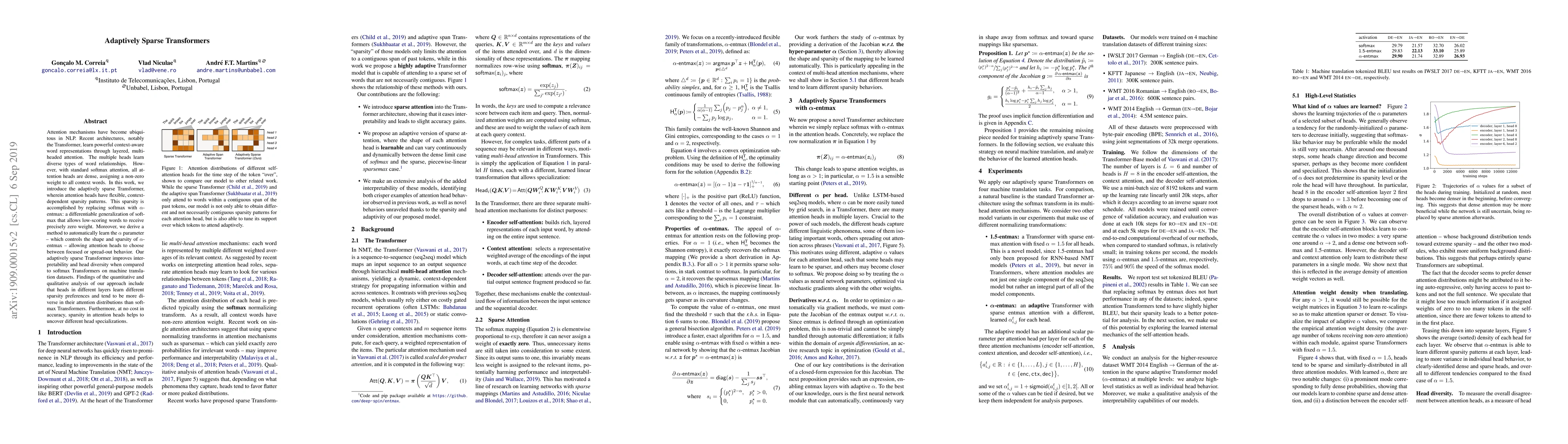 The adaptively sparse Transformer introduces a novel attention mechanism that replaces softmax with $\alpha$-entmax to enable context-dependent sparsity, improving interpretability and head diversity in machine translation. This approach allows attention heads to dynamically adjust their sparsity, enhancing specialization without sacrificing accuracy.