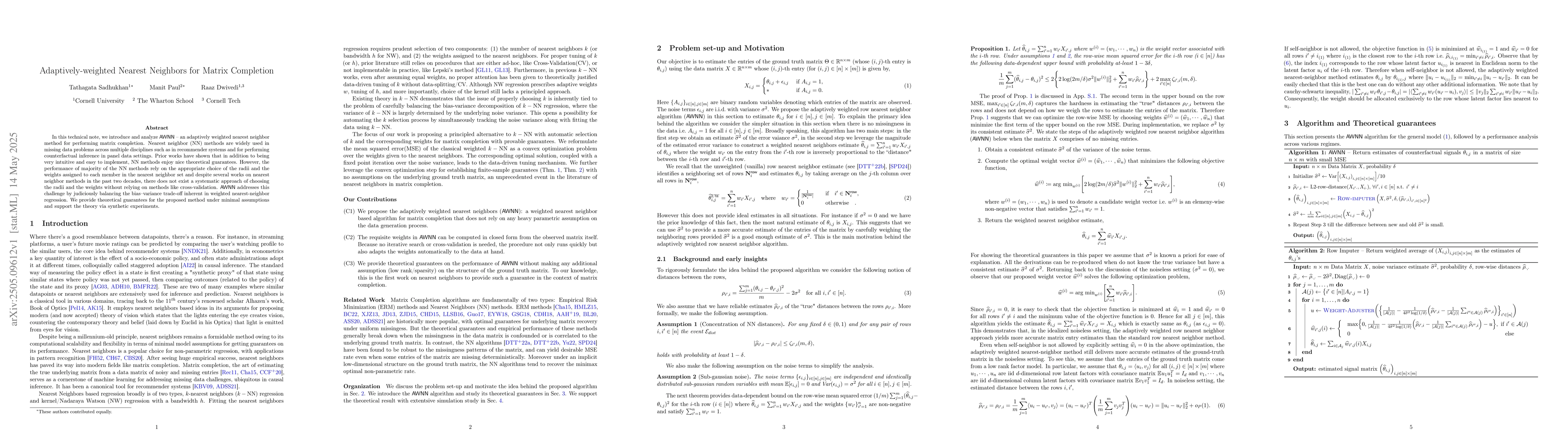 AWNN, an adaptively weighted nearest neighbor method providing theoretical guarantees for matrix completion under minimal assumptions.