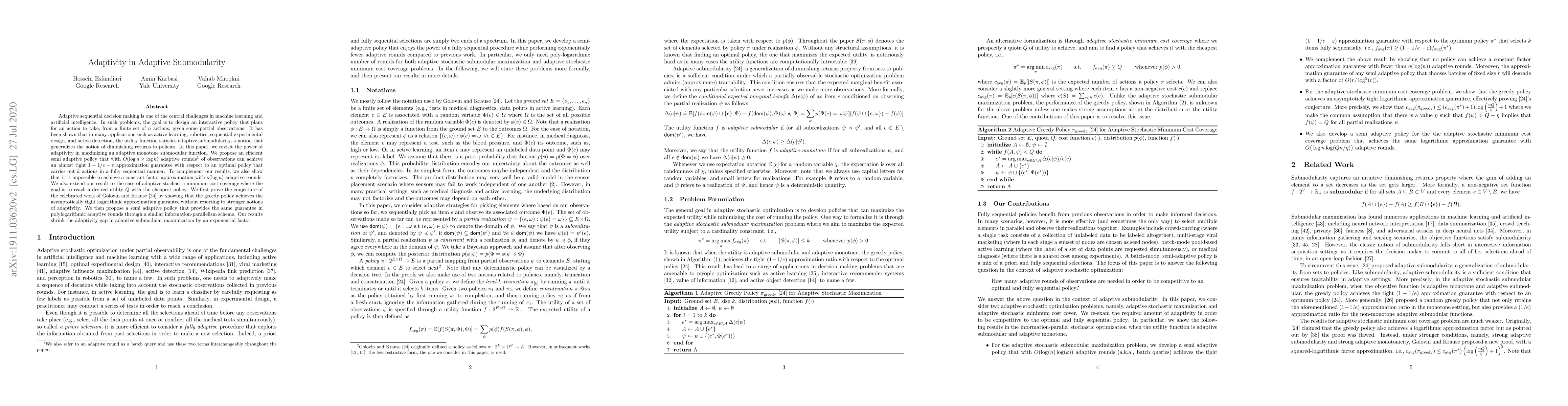 This paper explores adaptive sequential decision making in machine learning, focusing on maximizing adaptive monotone submodular functions. It proposes an efficient semi-adaptive policy achieving near-optimal results with $O(\log n \times \log k)$ adaptive rounds, while also proving the impossibility of constant factor approximation with fewer rounds. The study extends these findings to adaptive stochastic minimum cost coverage, confirming the logarithmic approximation guarantee of the greedy policy and introducing a semi-adaptive policy with polylogarithmic adaptive rounds.