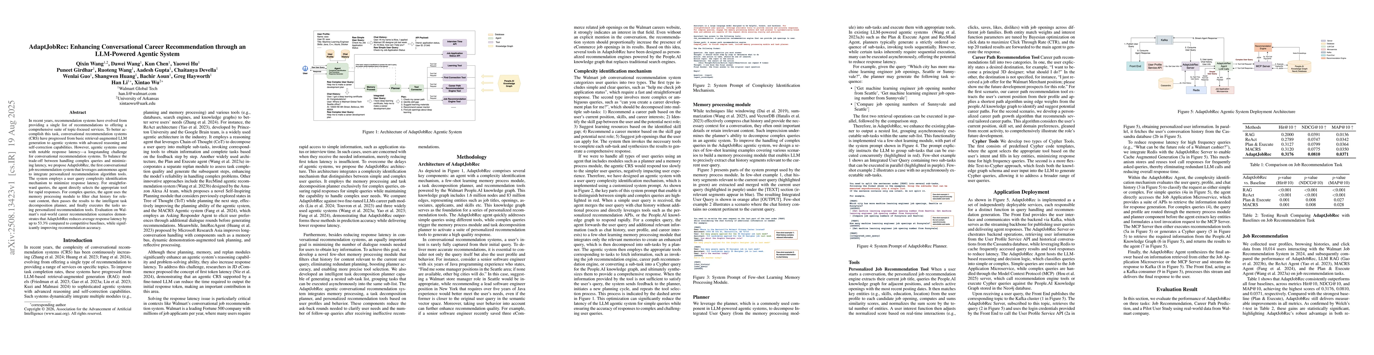 In recent years, recommendation systems have evolved from providing a single list of recommendations to offering a comprehensive suite of topic focused services. To better accomplish this task, conversational recommendation systems (CRS) have progressed from basic retrieval augmented LLM generation to agentic systems with advanced reasoning and self correction capabilities. However, agentic systems come with notable response latency, a longstanding challenge for conversational recommendation systems. To balance the trade off between handling complex queries and minimizing latency, we propose AdaptJobRec, the first conversational job recommendation system that leverages autonomous agent to integrate personalized recommendation algorithm tools. The system employs a user query complexity identification mechanism to minimize response latency. For straightforward queries, the agent directly selects the appropriate tool for rapid responses. For complex queries, the agent uses the memory processing module to filter chat history for relevant content, then passes the results to the intelligent task decomposition planner, and finally executes the tasks using personalized recommendation tools. Evaluation on Walmart's real world career recommendation scenarios demonstrates that AdaptJobRec reduces average response latency by up to 53.3% compared to competitive baselines, while significantly improving recommendation accuracy.