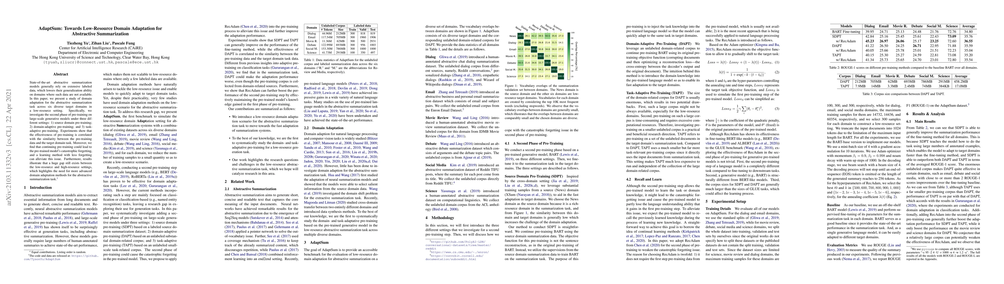 The paper proposes domain adaptation techniques for low-resource abstractive summarization, exploring different pre-training phases and finding that pre-training similarity is crucial. It identifies catastrophic forgetting in continuing pre-training and highlights the gap between low- and high-resource settings, calling for more advanced adaptation methods.