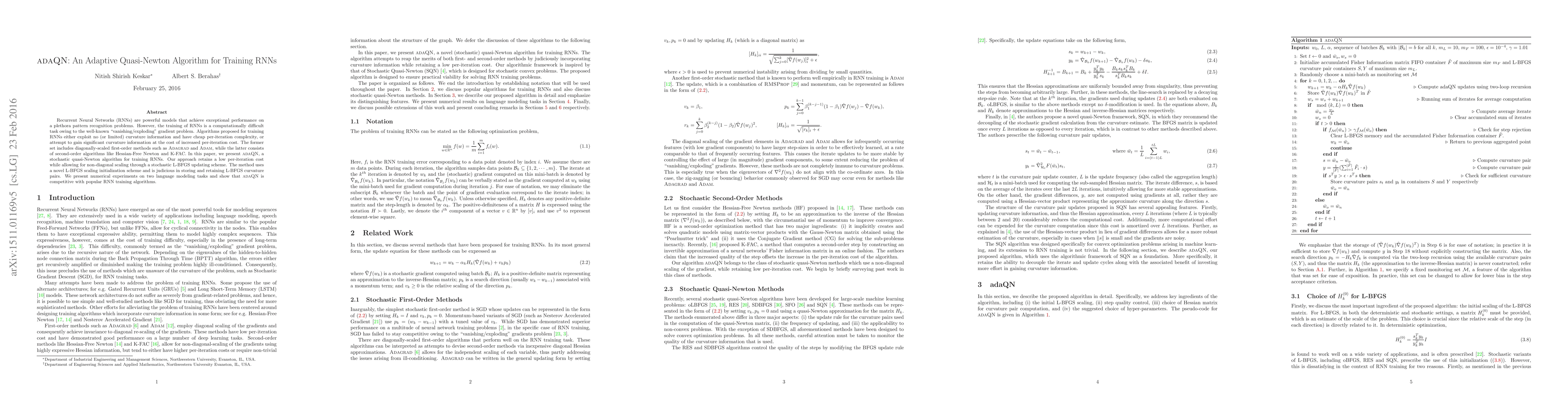 The paper introduces adaQN, an adaptive quasi-Newton algorithm for training Recurrent Neural Networks (RNNs) that balances low per-iteration cost with effective curvature information, outperforming other methods in language modeling tasks. The method employs a stochastic L-BFGS scheme for efficient training.