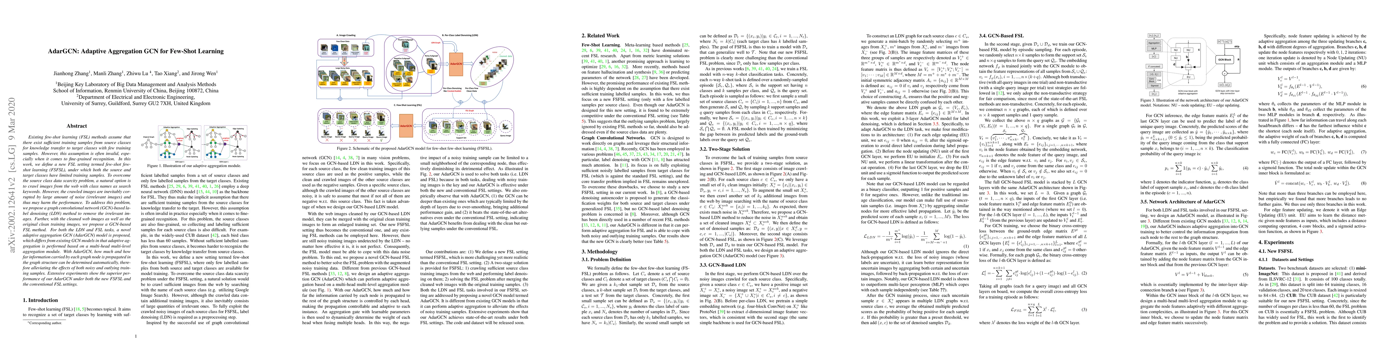 Existing few-shot learning (FSL) methods assume that there exist sufficient training samples from source classes for knowledge transfer to target classes with few training samples. However, this assumption is often invalid, especially when it comes to fine-grained recognition. In this work, we define a new FSL setting termed few-shot fewshot learning (FSFSL), under which both the source and target classes have limited training samples. To overcome the source class data scarcity problem, a natural option is to crawl images from the web with class names as search keywords. However, the crawled images are inevitably corrupted by large amount of noise (irrelevant images) and thus may harm the performance. To address this problem, we propose a graph convolutional network (GCN)-based label denoising (LDN) method to remove the irrelevant images. Further, with the cleaned web images as well as the original clean training images, we propose a GCN-based FSL method. For both the LDN and FSL tasks, a novel adaptive aggregation GCN (AdarGCN) model is proposed, which differs from existing GCN models in that adaptive aggregation is performed based on a multi-head multi-level aggregation module. With AdarGCN, how much and how far information carried by each graph node is propagated in the graph structure can be determined automatically, therefore alleviating the effects of both noisy and outlying training samples. Extensive experiments show the superior performance of our AdarGCN under both the new FSFSL and the conventional FSL settings.