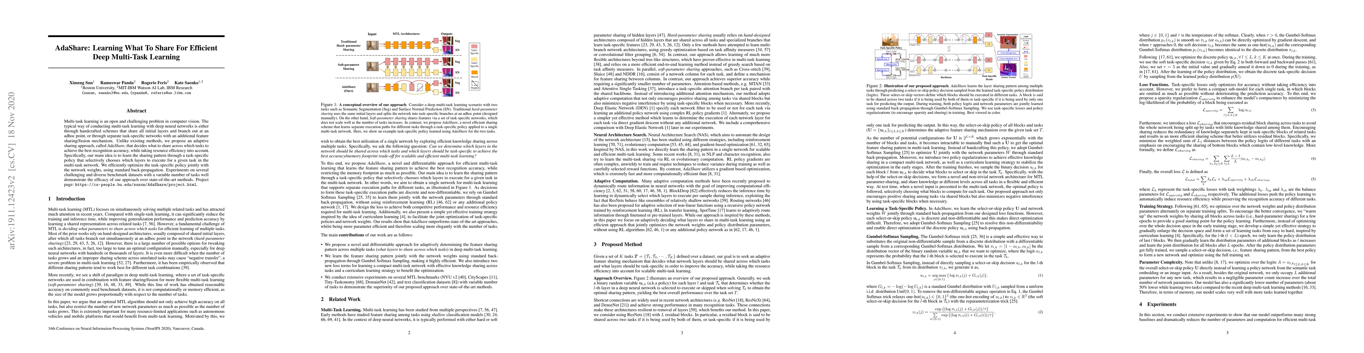 AdaShare proposes an adaptive sharing approach for efficient deep multi-task learning by learning a task-specific policy to selectively determine which layers to share across tasks, optimizing both network weights and policy jointly. This method outperforms existing methods on various benchmark datasets.