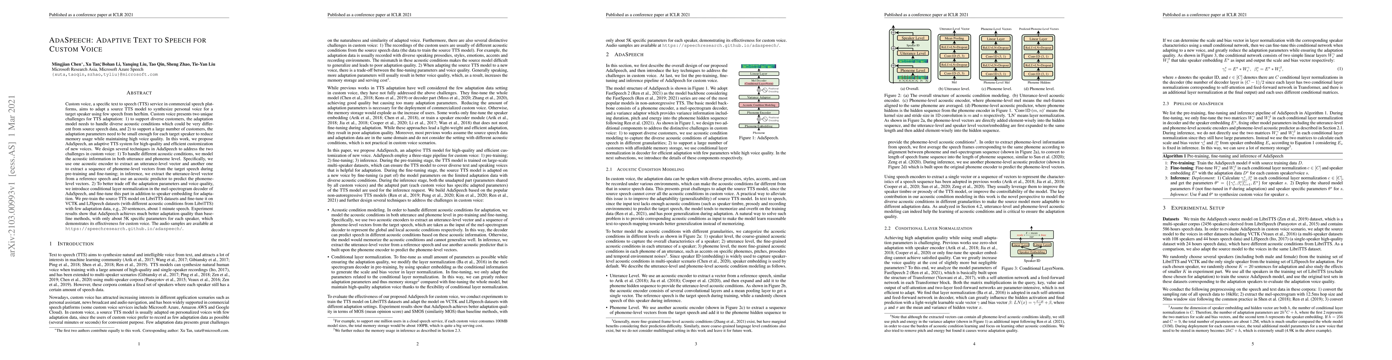 AdaSpeech is an adaptive text-to-speech system designed for efficient customization of new voices with minimal adaptation data. It employs two acoustic encoders and conditional layer normalization to handle diverse acoustic conditions and balance adaptation parameters with voice quality, achieving high adaptation quality with only 5K specific parameters per speaker.