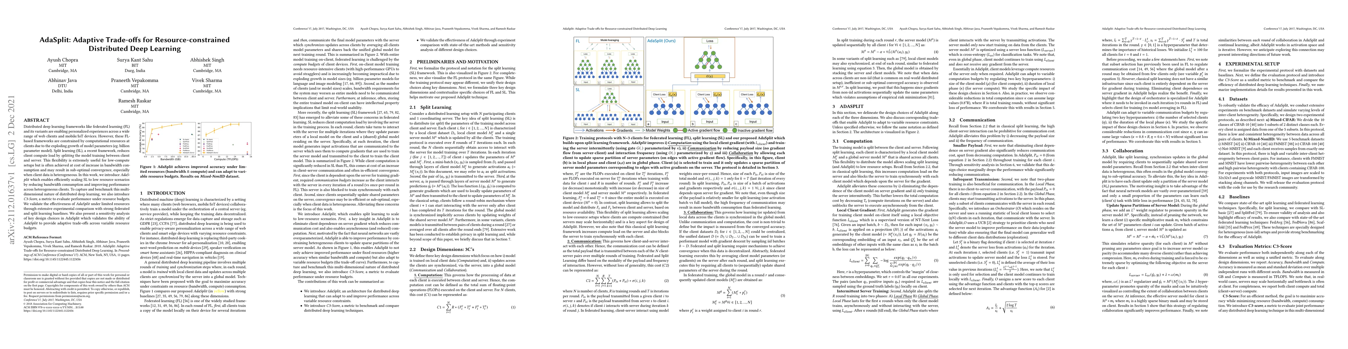 AdaSplit introduces a method to efficiently scale split learning for resource-constrained distributed deep learning, reducing bandwidth consumption and improving performance on heterogeneous clients. The C3-Score metric evaluates performance under resource constraints, and extensive experiments validate AdaSplit's effectiveness against federated and split learning baselines.