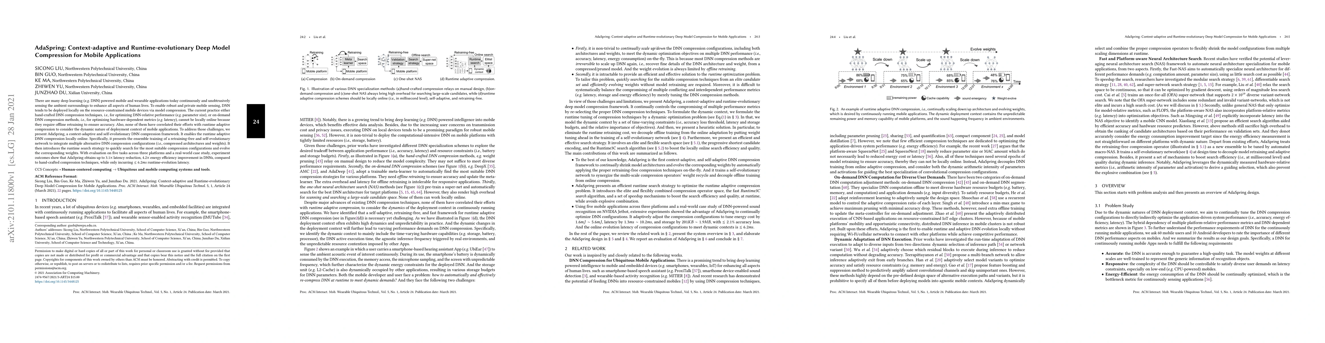 AdaSpring is a novel framework for context-adaptive and runtime-evolutionary deep model compression for mobile applications, enabling local online compression without retraining. It achieves significant reductions in latency and energy efficiency compared to traditional methods, with minimal runtime-evolution overhead.