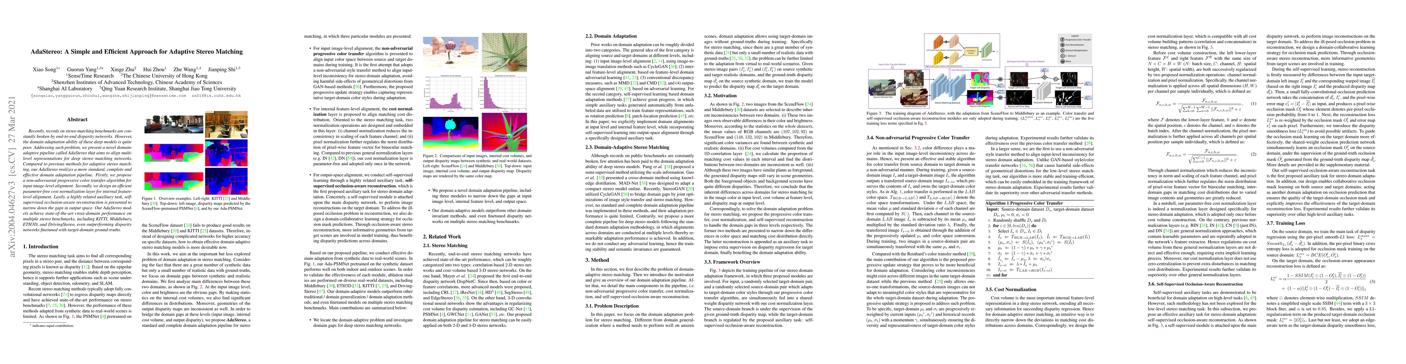 AdaStereo introduces an adaptive stereo matching pipeline that enhances domain adaptation through multi-level representation alignment, achieving state-of-the-art cross-domain performance on various benchmarks by employing a non-adversarial color transfer, cost normalization, and self-supervised occlusion-aware reconstruction.
