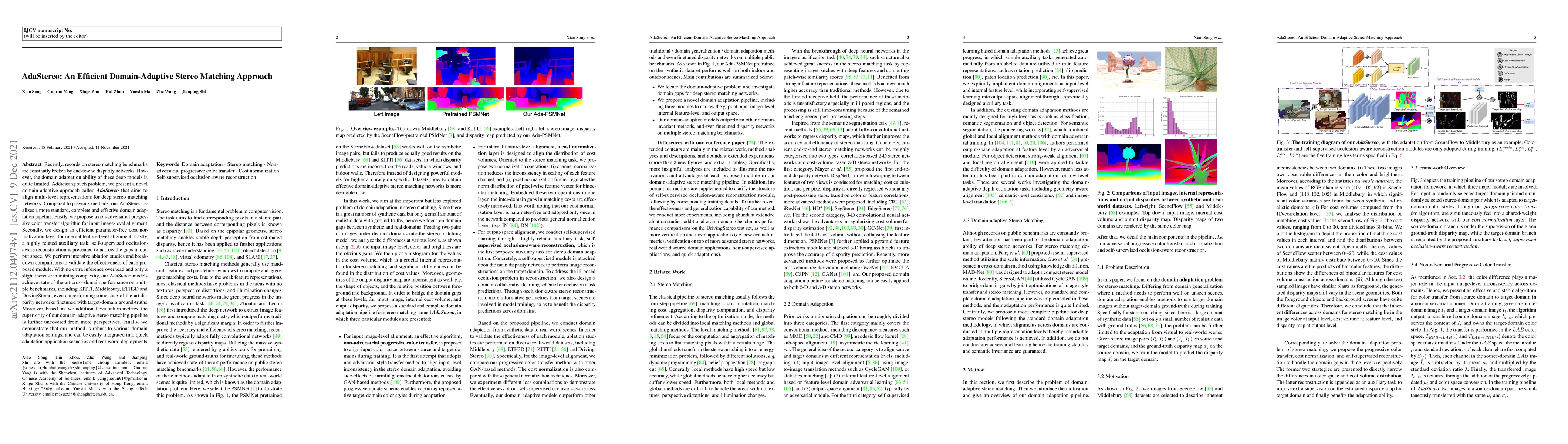 AdaStereo introduces a novel domain-adaptive stereo matching approach that aligns multi-level representations for deep networks, achieving state-of-the-art cross-domain performance with minimal extra inference overhead. The method includes a non-adversarial progressive color transfer, a parameter-free cost normalization layer, and a self-supervised occlusion-aware reconstruction task.