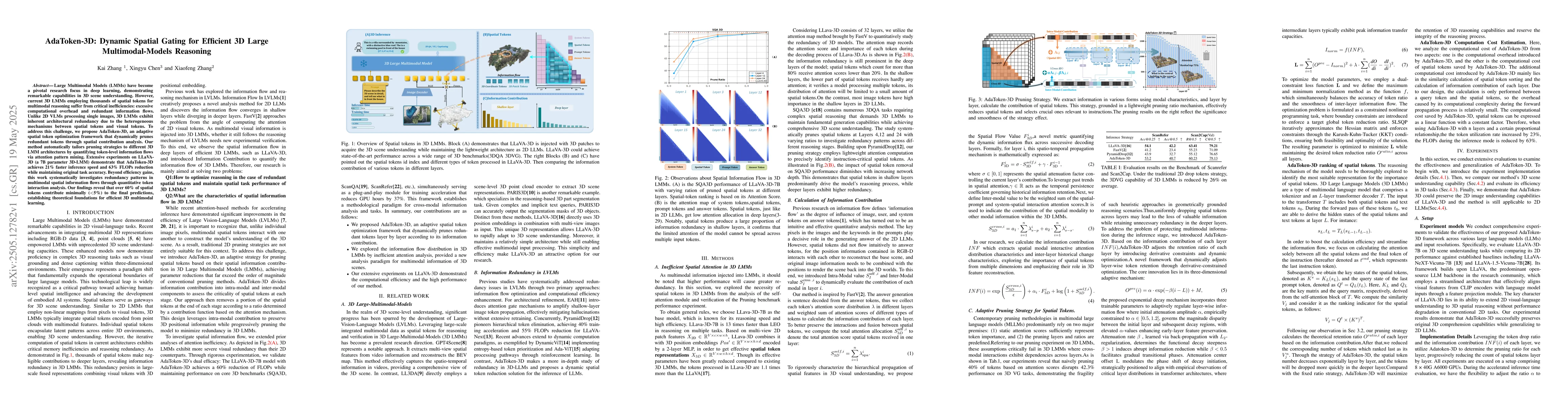 AdaToken-3D introduces an adaptive framework for dynamic spatial token optimization, enabling efficient 3D multimodal reasoning through pruning strategies based on token contribution analysis.