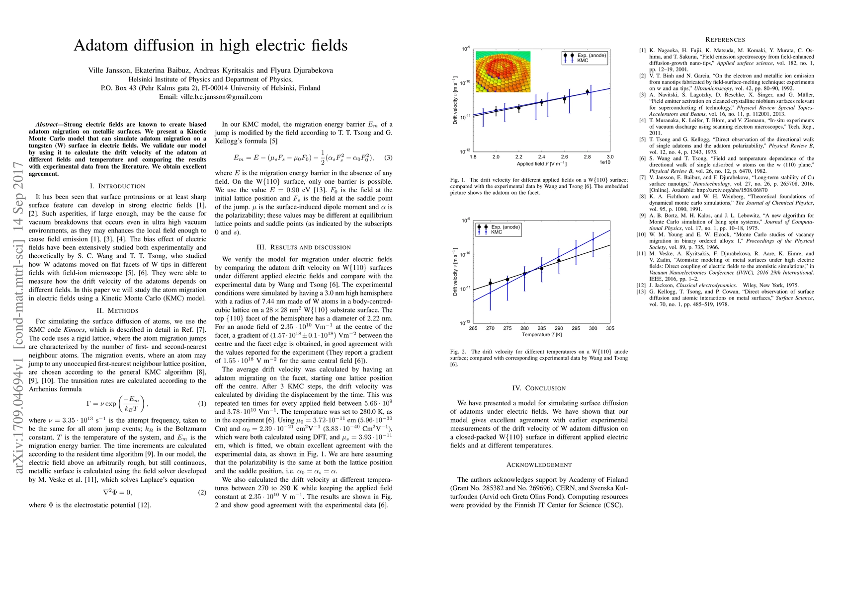 The paper presents a Kinetic Monte Carlo model simulating adatom migration on a tungsten surface under electric fields, validated by comparing calculated drift velocities with experimental data, achieving excellent agreement.