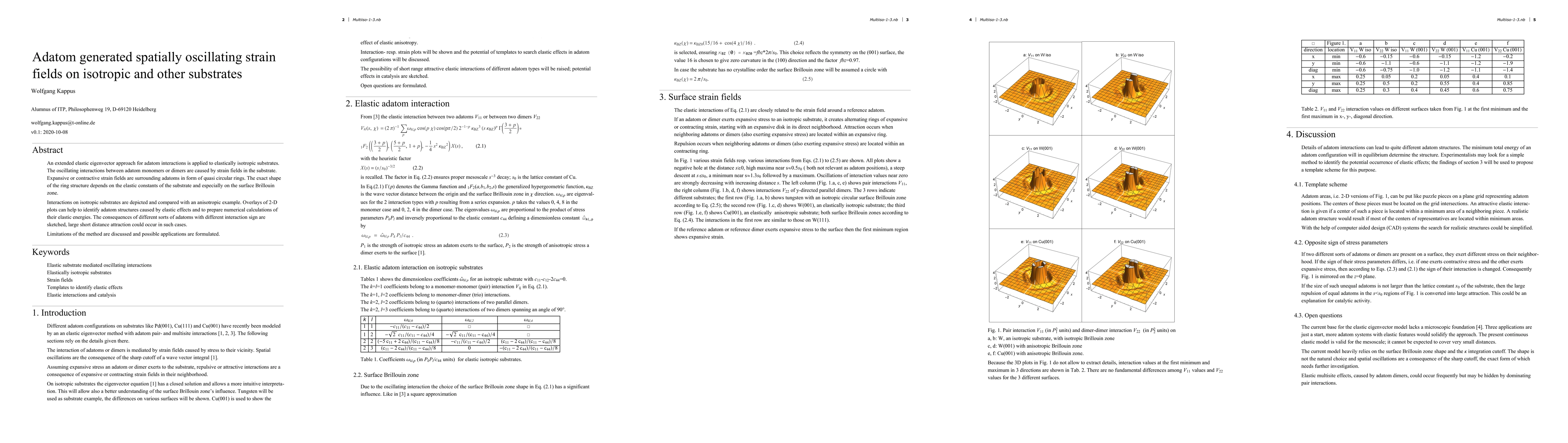 This research applies an extended elastic eigenvector approach to analyze oscillating strain fields generated by adatoms on elastically isotropic substrates, revealing quasi-circular ring interactions. It contrasts these effects on isotropic versus anisotropic substrates, and discusses applications and limitations of the method.