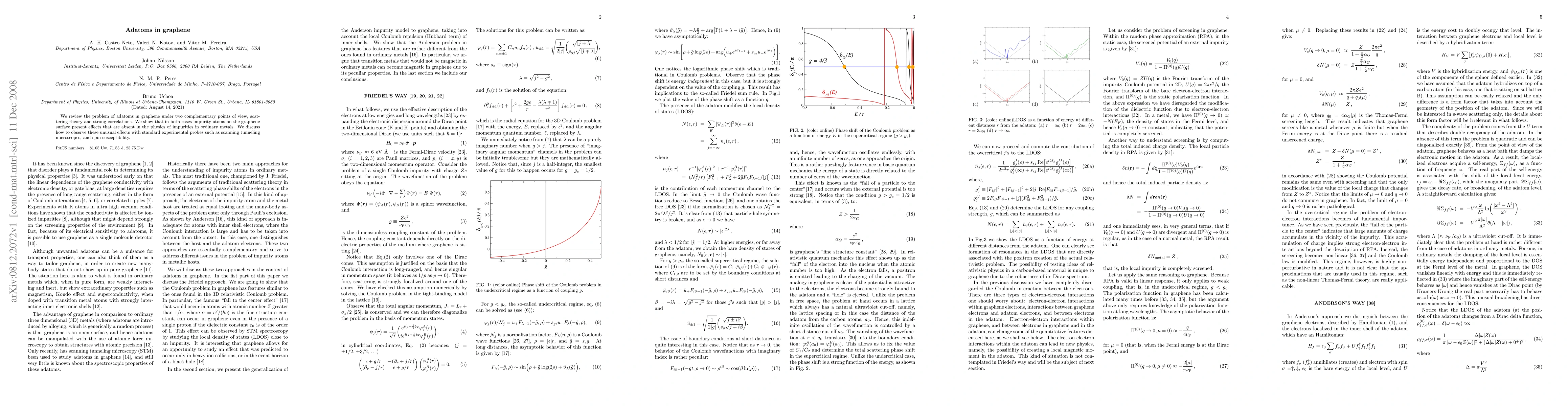 We review the problem of adatoms in graphene under two complementary points of view, scattering theory and strong correlations. We show that in both cases impurity atoms on the graphene surface present effects that are absent in the physics of impurities in ordinary metals. We discuss how to observe these unusual effects with standard experimental probes such as scanning tunneling microscopes, and spin susceptibility.