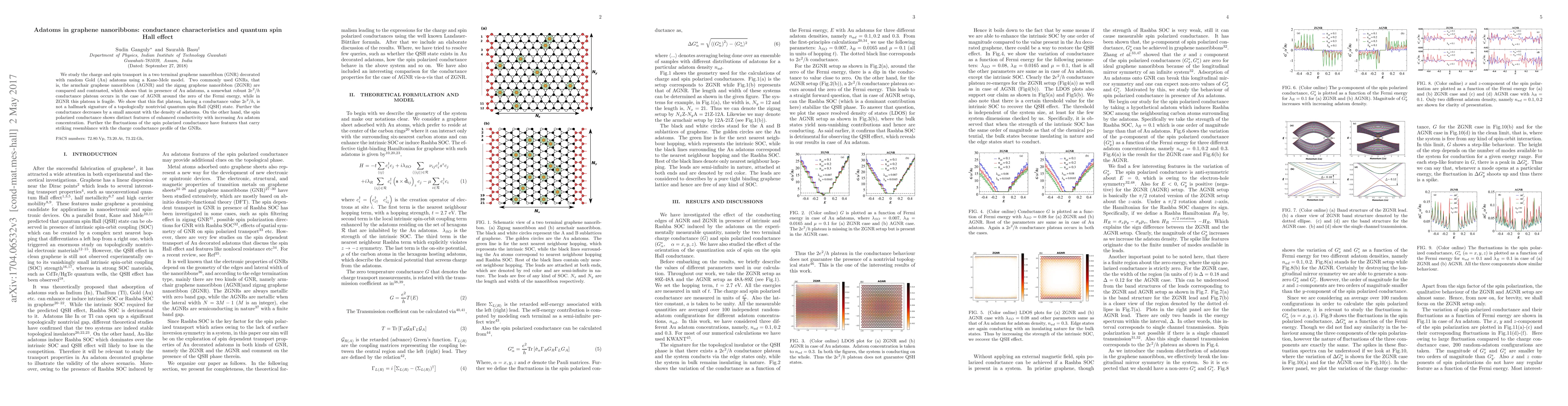 This research investigates charge and spin transport in graphene nanoribbons (GNRs) with Gold adatoms, showing a robust $2e^2/h$ conductance plateau in armchair GNRs but a fragile one in zigzag GNRs. It concludes that this plateau does not signify a topologically nontrivial quantum spin Hall state, while spin polarized conductance exhibits enhanced conductivity with increased adatom density.