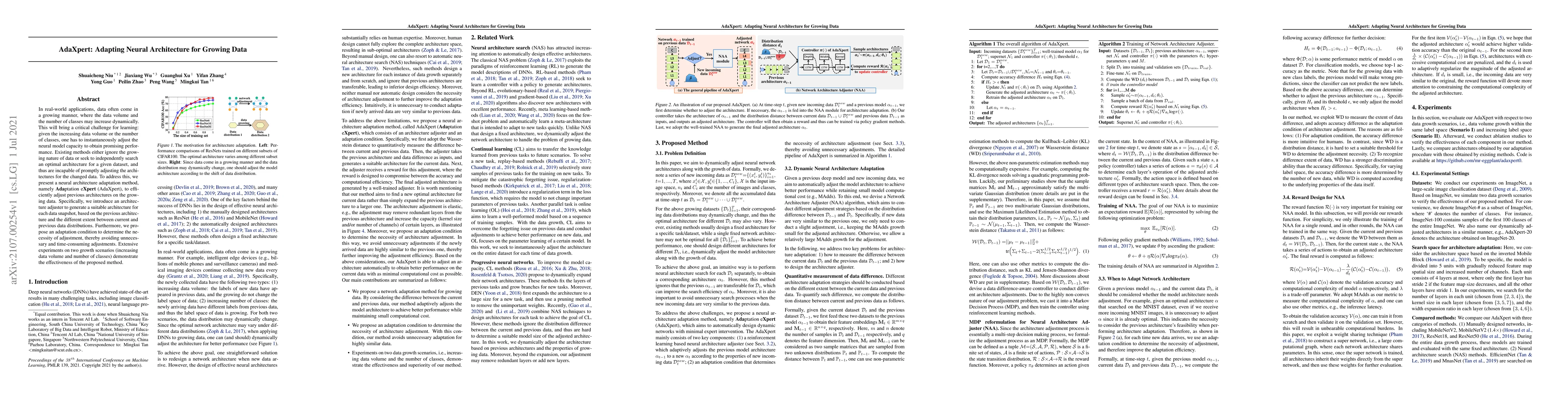 In real-world applications, data often come in a growing manner, where the data volume and the number of classes may increase dynamically. This will bring a critical challenge for learning: given the increasing data volume or the number of classes, one has to instantaneously adjust the neural model capacity to obtain promising performance. Existing methods either ignore the growing nature of data or seek to independently search an optimal architecture for a given dataset, and thus are incapable of promptly adjusting the architectures for the changed data. To address this, we present a neural architecture adaptation method, namely Adaptation eXpert (AdaXpert), to efficiently adjust previous architectures on the growing data. Specifically, we introduce an architecture adjuster to generate a suitable architecture for each data snapshot, based on the previous architecture and the different extent between current and previous data distributions. Furthermore, we propose an adaptation condition to determine the necessity of adjustment, thereby avoiding unnecessary and time-consuming adjustments. Extensive experiments on two growth scenarios (increasing data volume and number of classes) demonstrate the effectiveness of the proposed method.