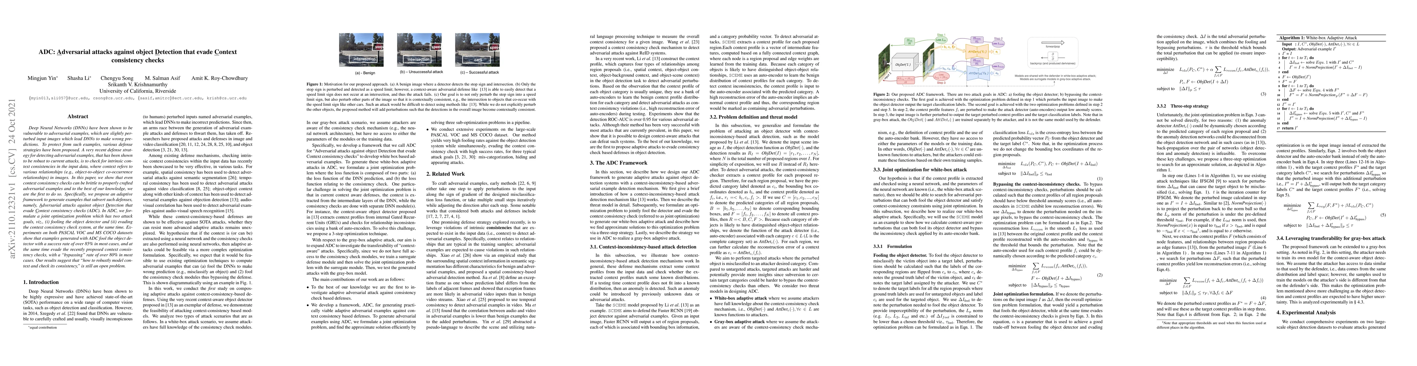 Deep Neural Networks (DNNs) have been shown to be vulnerable to adversarial examples, which are slightly perturbed input images which lead DNNs to make wrong predictions. To protect from such examples, various defense strategies have been proposed. A very recent defense strategy for detecting adversarial examples, that has been shown to be robust to current attacks, is to check for intrinsic context consistencies in the input data, where context refers to various relationships (e.g., object-to-object co-occurrence relationships) in images. In this paper, we show that even context consistency checks can be brittle to properly crafted adversarial examples and to the best of our knowledge, we are the first to do so. Specifically, we propose an adaptive framework to generate examples that subvert such defenses, namely, Adversarial attacks against object Detection that evade Context consistency checks (ADC). In ADC, we formulate a joint optimization problem which has two attack goals, viz., (i) fooling the object detector and (ii) evading the context consistency check system, at the same time. Experiments on both PASCAL VOC and MS COCO datasets show that examples generated with ADC fool the object detector with a success rate of over 85% in most cases, and at the same time evade the recently proposed context consistency checks, with a bypassing rate of over 80% in most cases. Our results suggest that how to robustly model context and check its consistency, is still an open problem.