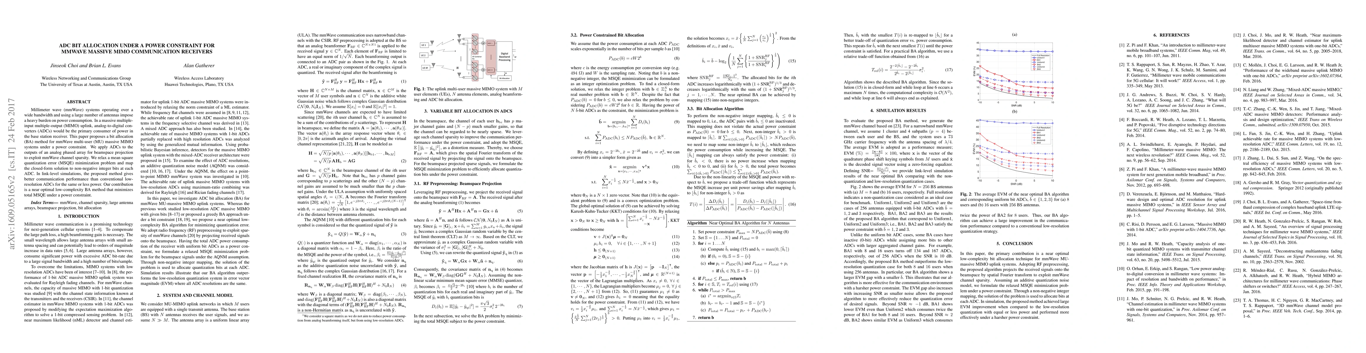 This paper proposes a bit allocation method for mmWave massive MIMO systems to minimize power consumption in ADCs while maintaining communication performance. The method optimizes bit allocation under a power constraint, achieving better performance compared to conventional low-resolution ADCs.