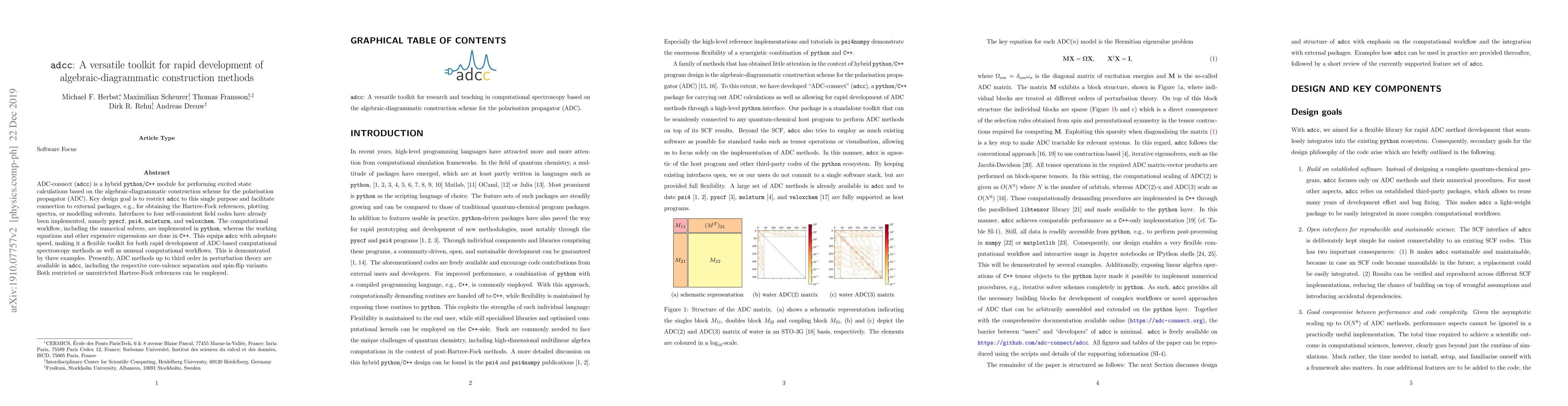 ADC-connect (adcc) is a hybrid Python/C++ module for excited state calculations using the algebraic-diagrammatic construction scheme. It interfaces with various self-consistent field codes and supports rapid development of ADC-based computational spectroscopy methods.