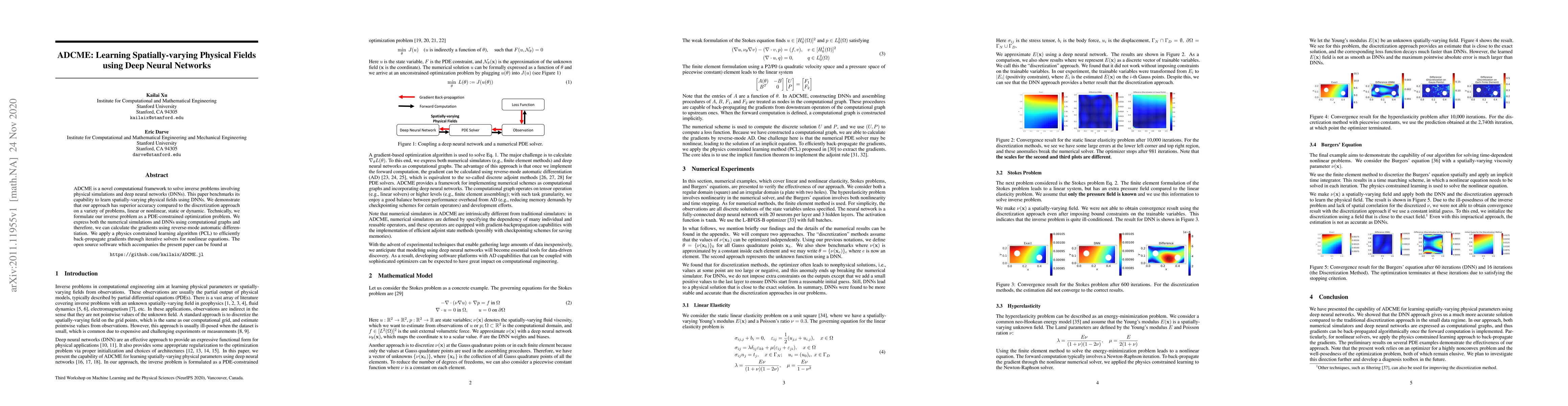 ADCME is a novel computational framework to solve inverse problems involving physical simulations and deep neural networks (DNNs). This paper benchmarks its capability to learn spatially-varying physical fields using DNNs. We demonstrate that our approach has superior accuracy compared to the discretization approach on a variety of problems, linear or nonlinear, static or dynamic. Technically, we formulate our inverse problem as a PDE-constrained optimization problem. We express both the numerical simulations and DNNs using computational graphs and therefore, we can calculate the gradients using reverse-mode automatic differentiation. We apply a physics constrained learning algorithm (PCL) to efficiently back-propagate gradients through iterative solvers for nonlinear equations. The open-source software which accompanies the present paper can be found at https://github.com/kailaix/ADCME.jl.