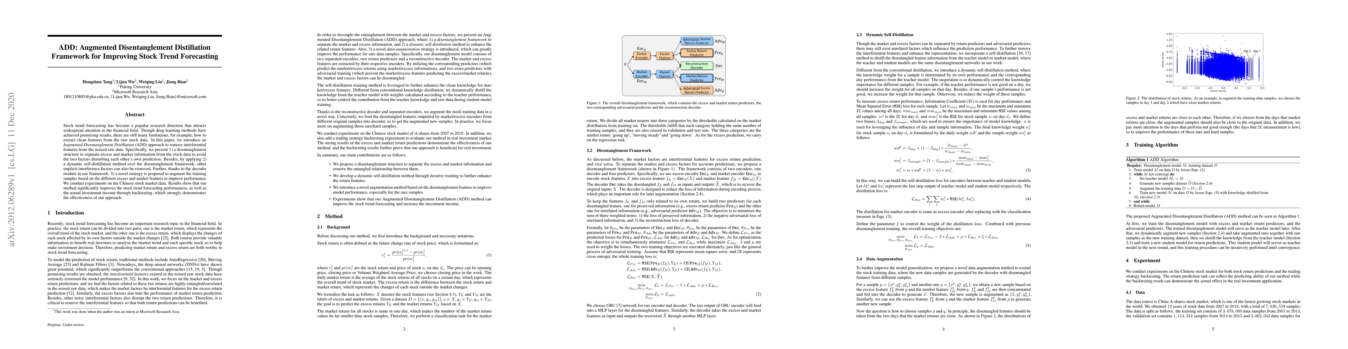 The paper introduces the Augmented Disentanglement Distillation (ADD) framework to enhance stock trend forecasting by extracting clean features from noisy data. The ADD approach disentangles excess and market information, employs dynamic self-distillation to remove interference, and augments training samples to improve performance, achieving better forecasting results.