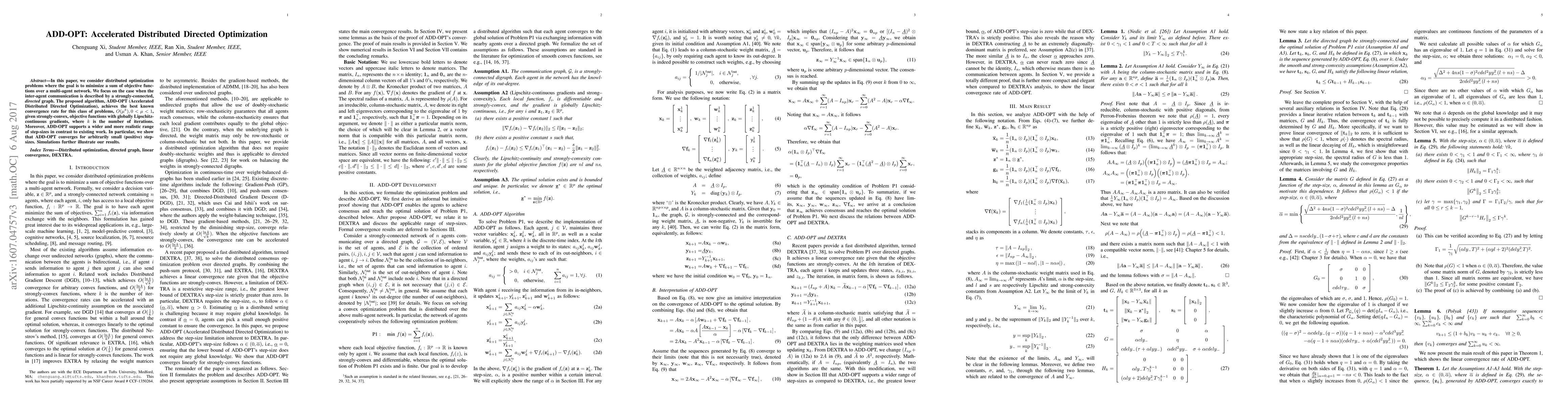 In this paper, we consider distributed optimization problems where the goal is to minimize a sum of objective functions over a multi-agent network. We focus on the case when the inter-agent communication is described by a strongly-connected, \emph{directed} graph. The proposed algorithm, ADD-OPT (Accelerated Distributed Directed Optimization), achieves the best known convergence rate for this class of problems,~$O(\mu^{k}),0<\mu<1$, given strongly-convex, objective functions with globally Lipschitz-continuous gradients, where~$k$ is the number of iterations. Moreover, ADD-OPT supports a wider and more realistic range of step-sizes in contrast to existing work. In particular, we show that ADD-OPT converges for arbitrarily small (positive) step-sizes. Simulations further illustrate our results.