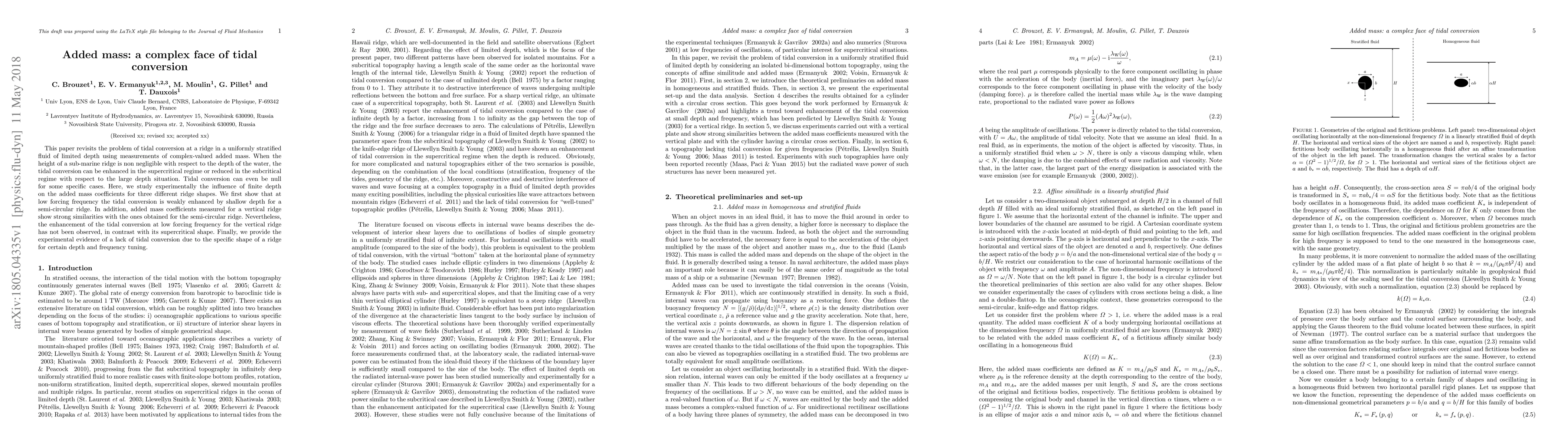 This research experimentally investigates how the shape and depth of submerged ridges affect tidal energy conversion, finding that ridge shape and depth significantly influence added mass coefficients. For certain ridge shapes and frequency-depth combinations, tidal conversion can be null, highlighting the complex nature of tidal energy conversion in shallow waters.
