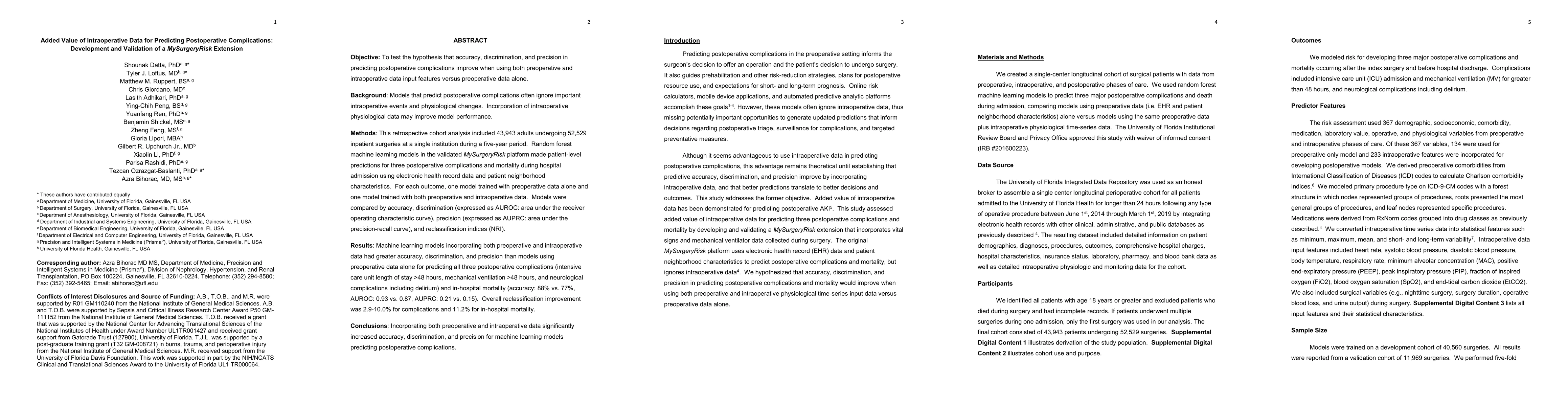 This study demonstrates that machine learning models incorporating both preoperative and intraoperative data significantly improve the accuracy, discrimination, and precision of predictions for postoperative complications and in-hospital mortality compared to models using preoperative data alone. The findings suggest the added value of intraoperative physiological data in enhancing predictive models.