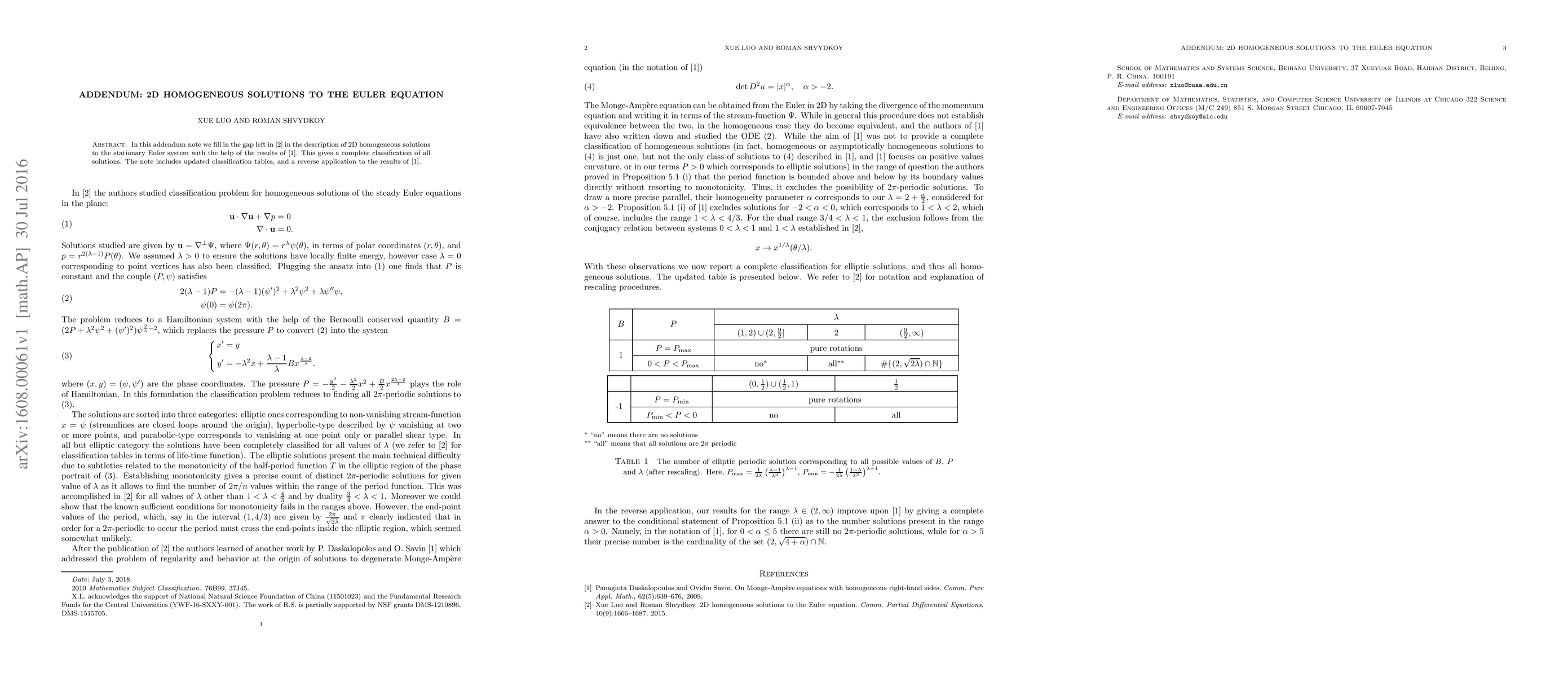 Researchers fill in a gap in their previous work to classify 2D homogeneous solutions to the Euler equation, providing a complete understanding of all possible solutions. Updated classification tables and a reverse application to other related research are also included.