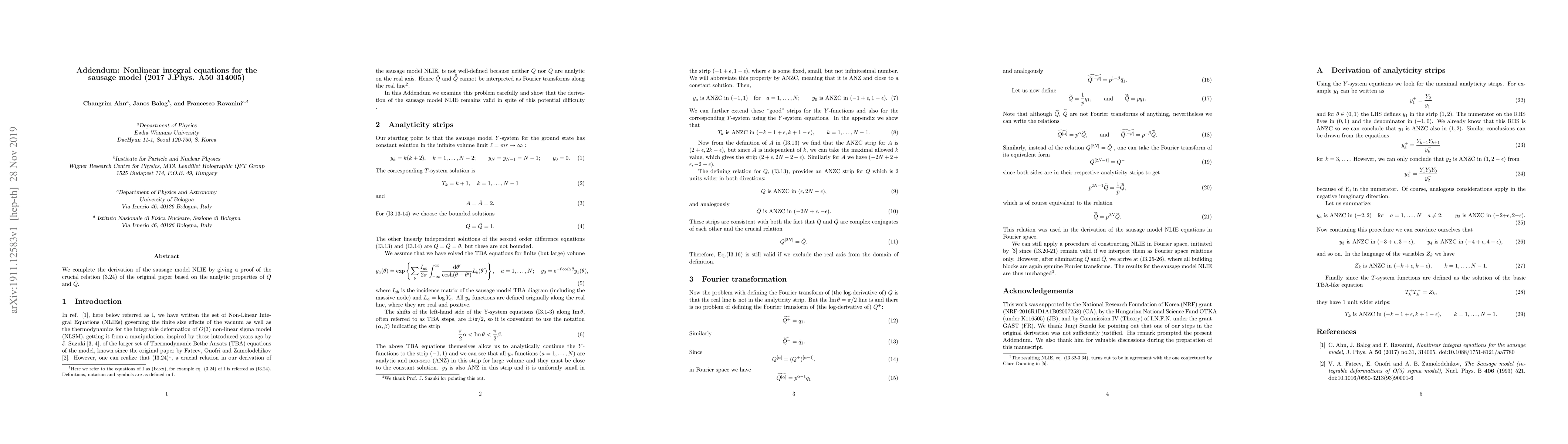 We complete the derivation of the sausage model NLIE by giving a proof of the crucial relation (3.24) of the original paper based on the analytic properties of $Q$ and $\bar Q$.