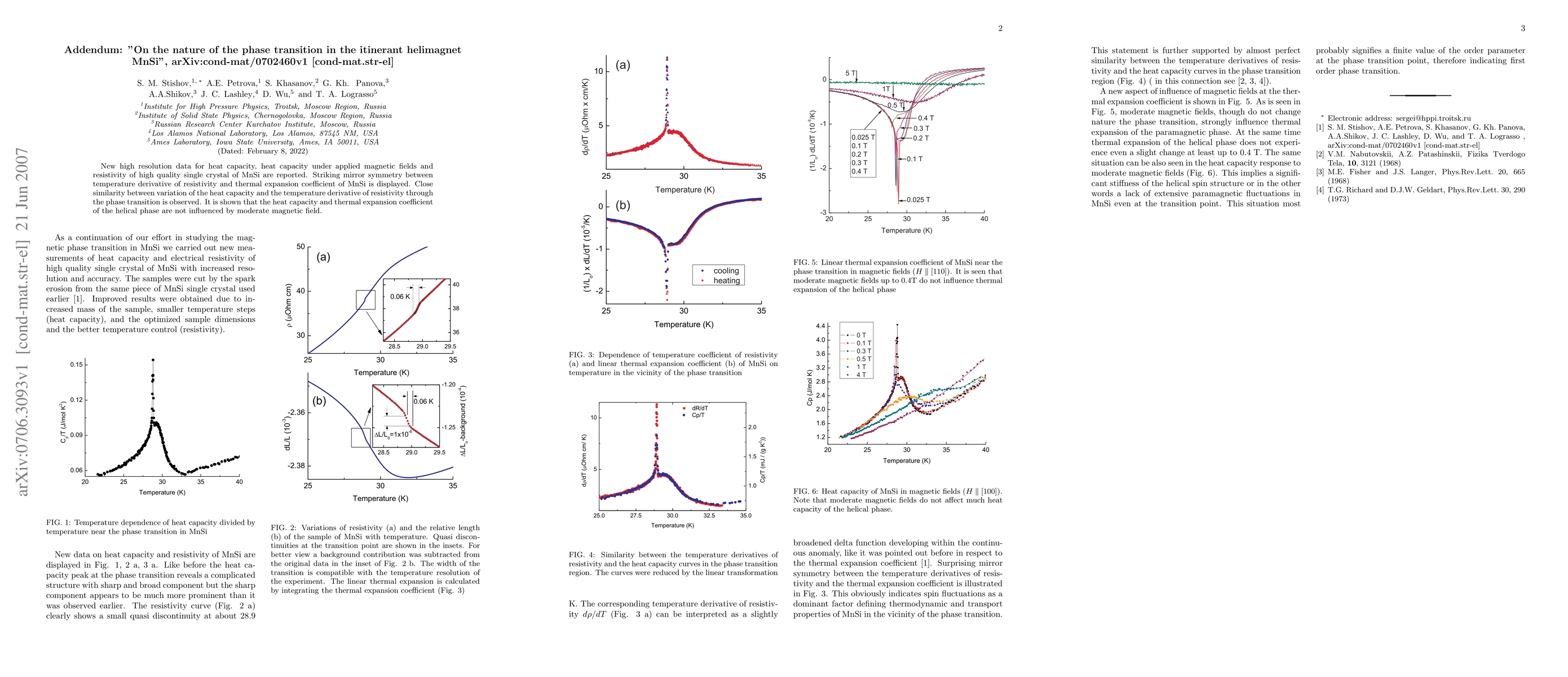 New high resolution data for heat capacity, heat capacity under applied magnetic fields and resistivity of high quality single crystal of MnSi are reported. Striking mirror symmetry between temperature derivative of resistivity and thermal expansion coefficient of MnSi is displayed. Close similarity between variation of the heat capacity and the temperature derivative of resistivity through the phase transition is observed. It is shown that the heat capacity and thermal expansion coefficient of the helical phase are not influenced by moderate magnetic field.