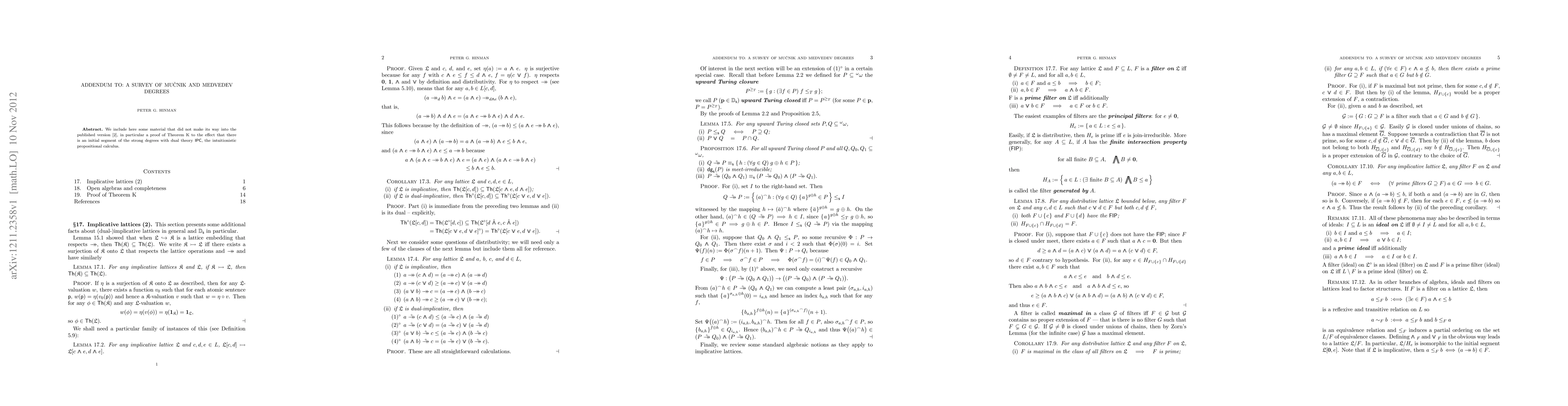 We include here some material that did not make its way into the published version (Bull. Symb. Log 18-2, June 2012, pp. 161-229, arXiv:1007.2376), in particular a proof of Theorem K to the effect that there is an initial segment of the strong degrees with dual theory IPC, the intuitionistic propositional calculus.