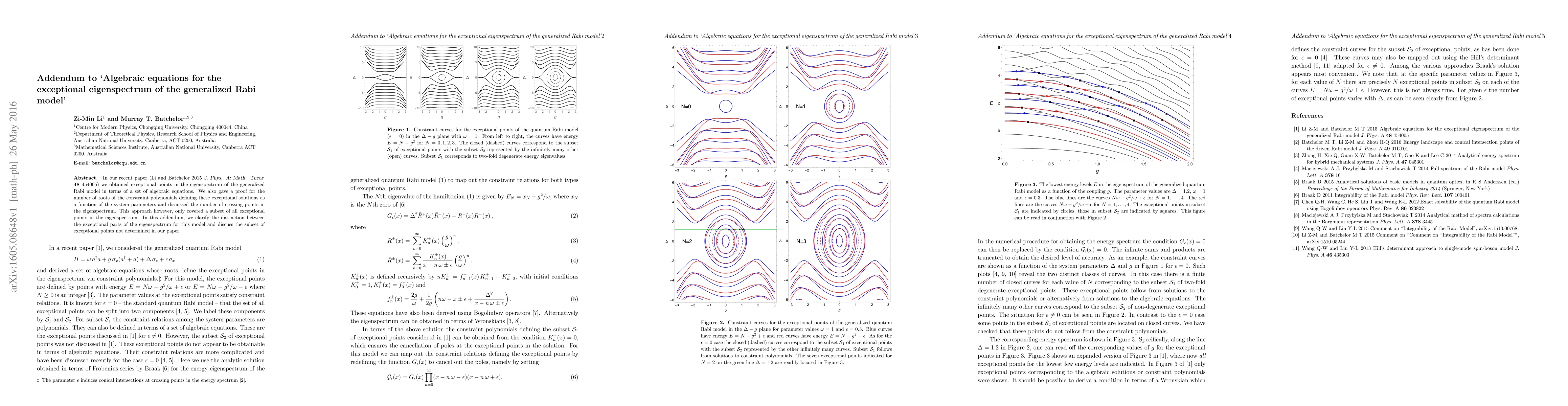 In our recent paper (Li and Batchelor J. Phys. A: Math. Theor. 48, 454005 (2015)) we obtained exceptional points in the eigenspectrum of the generalized Rabi model in terms of a set of algebraic equations. We also gave a proof for the number of roots of the constraint polynomials defining these exceptional solutions as a function of the system parameters and discussed the number of crossing points in the eigenspectrum. This approach however, only covered a subset of all exceptional points in the eigenspectrum. In this addendum, we clarify the distinction between the exceptional parts of the eigenspectrum for this model and discuss the subset of exceptional points not determined in our paper.