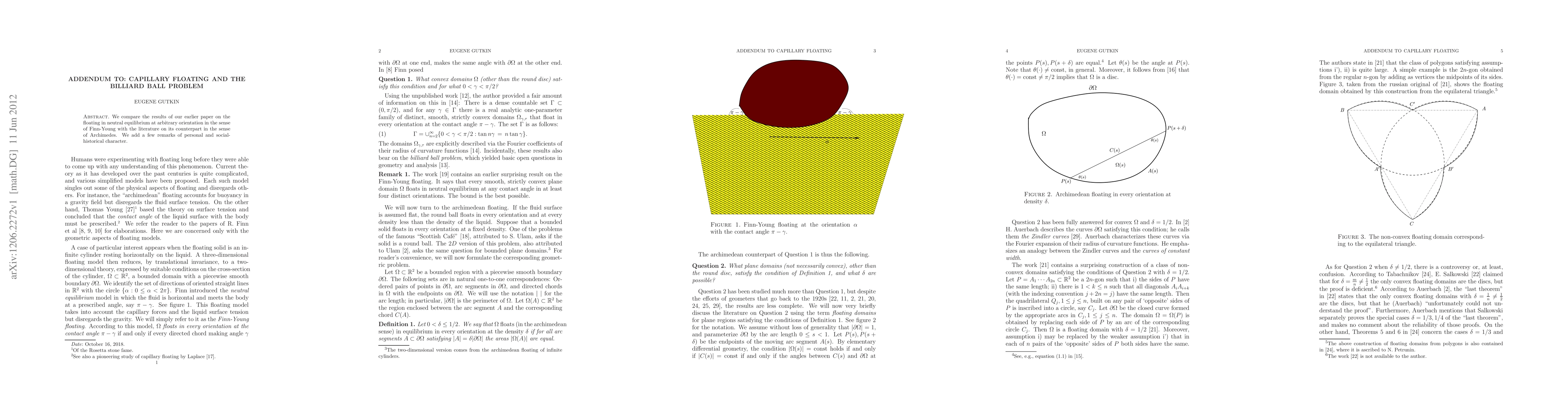 We compare the results of our earlier paper on the floating in neutral equilibrium at arbitrary orientation in the sense of Finn-Young with the literature on its counterpart in the sense of Archimedes. We add a few remarks of personal and social-historical character.