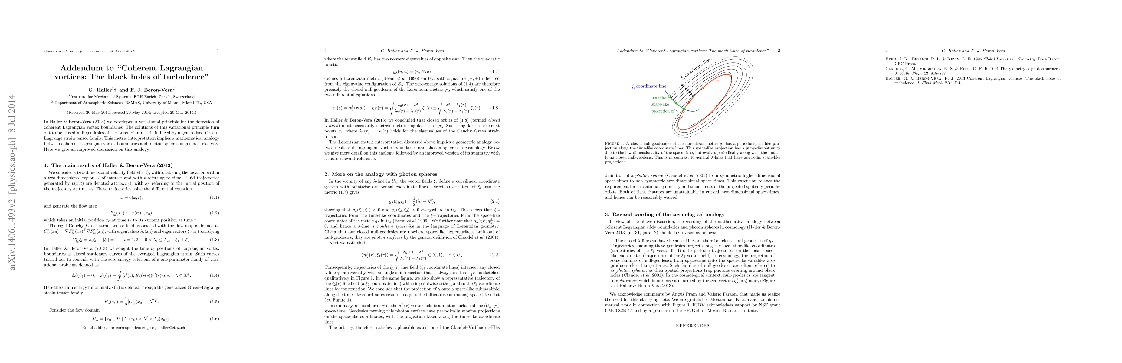 In Haller and Beron-Vera (2013) we developed a variational principle for the detection of coherent Lagrangian vortex boundaries. The solutions of this variational principle turn out to be closed null-geodesics of the Lorentzian metric associated with a generalized Green-Lagrange strain tensor family. This metric interpretation implies a mathematical analogy between coherent Lagrangian vortex boundaries and photon spheres in general relativity. Here we give an improved discussion on this analogy.