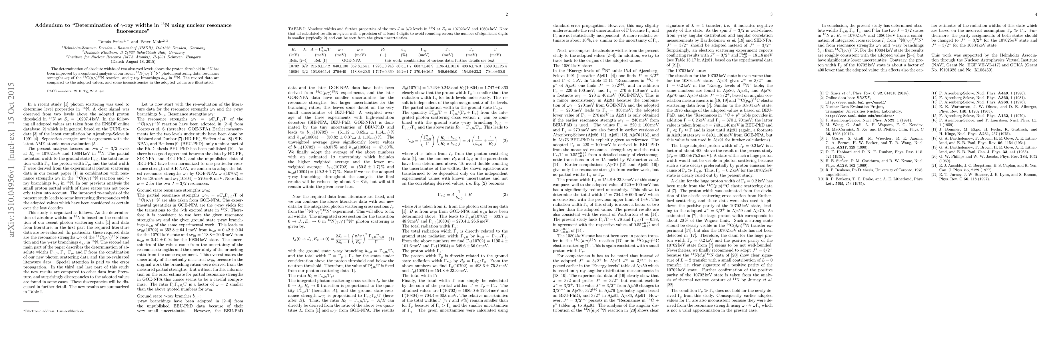 The determination of absolute widths of two observed levels above the proton threshold in $^{15}$N has been improved by a combined analysis of our recent $^{15}$N($\gamma$,$\gamma'$)$^{15}$N$^\ast$ photon scattering data, resonance strengths $\omega\gamma$ of the $^{14}$C($p$,$\gamma$)$^{15}$N reaction, and $\gamma$-ray branchings $b_{\gamma,i}$ in $^{15}$N. The revised data are compared to the adopted values, and some inconsistencies in the adopted values are illustrated.