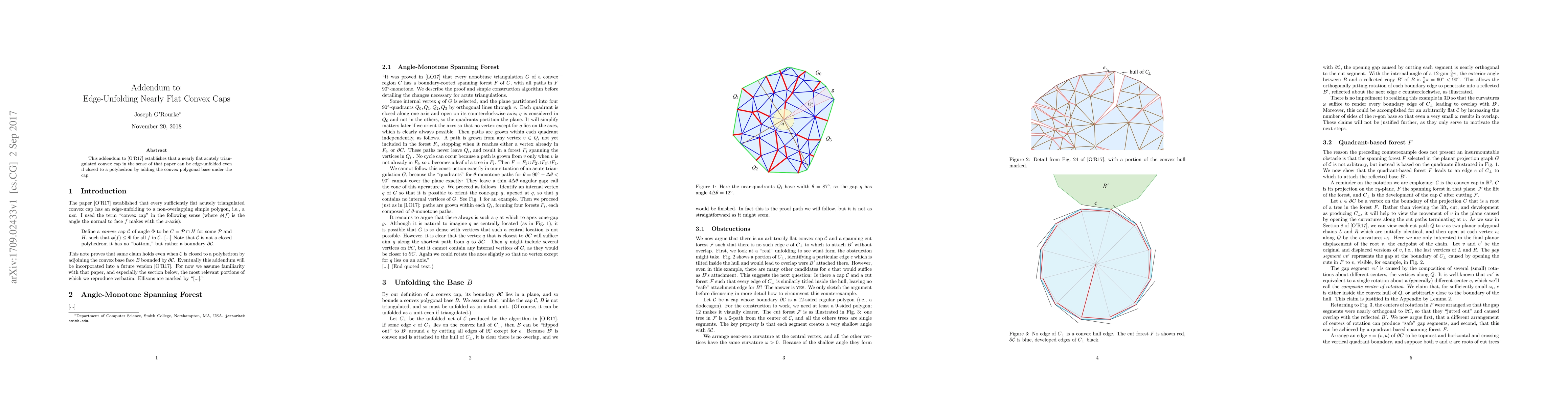 This addendum confirms that a nearly flat acutely triangulated convex cap can be edge-unfolded into a polyhedron even when closed by adding a convex polygonal base beneath the cap, extending the findings of [O'R17].