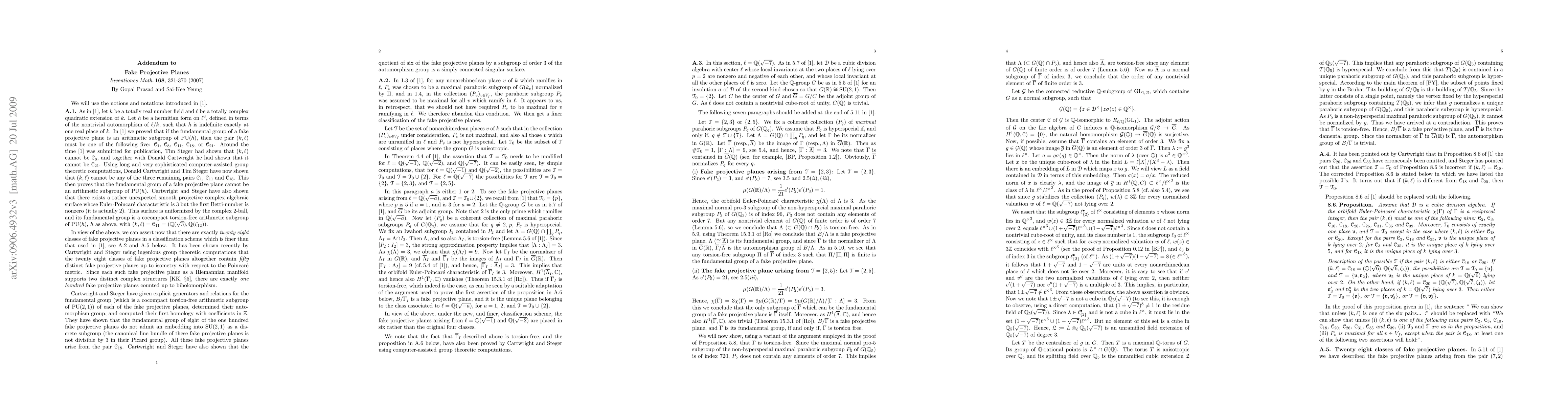 This addendum updates the classification of fake projective planes, now categorizing them into twenty-six classes. The work, in collaboration with Cartwright and Steger, completes the list of such complex surfaces, confirming there are exactly one hundred fake projective planes up to biholomorphism.