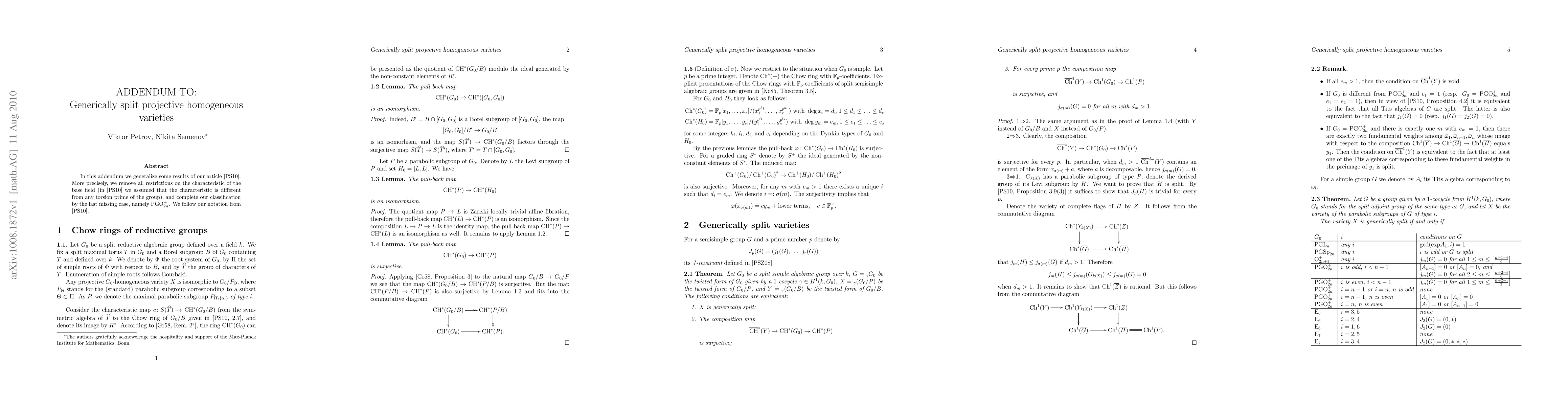 In this addendum we generalize some results of our article "Generically split projective homogeneous varieties", Duke Math. J. 152 (2010), no. 1, 155-173. More precisely, we remove all restrictions on the characteristic of the base field and complete our classification by the last missing case, namely $\PGO_{2n}^+$.