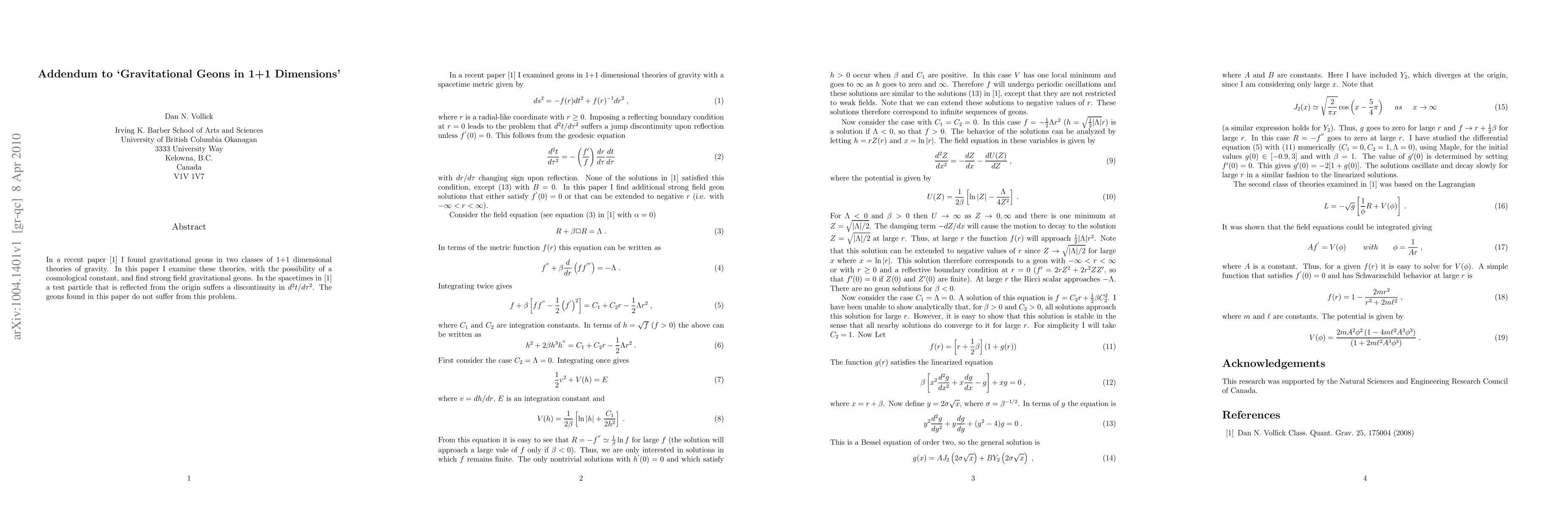 This paper extends previous research on gravitational geons in 1+1 dimensional gravity theories, exploring them with a cosmological constant. Unlike earlier findings, the geons identified here do not exhibit discontinuities in the acceleration of test particles.