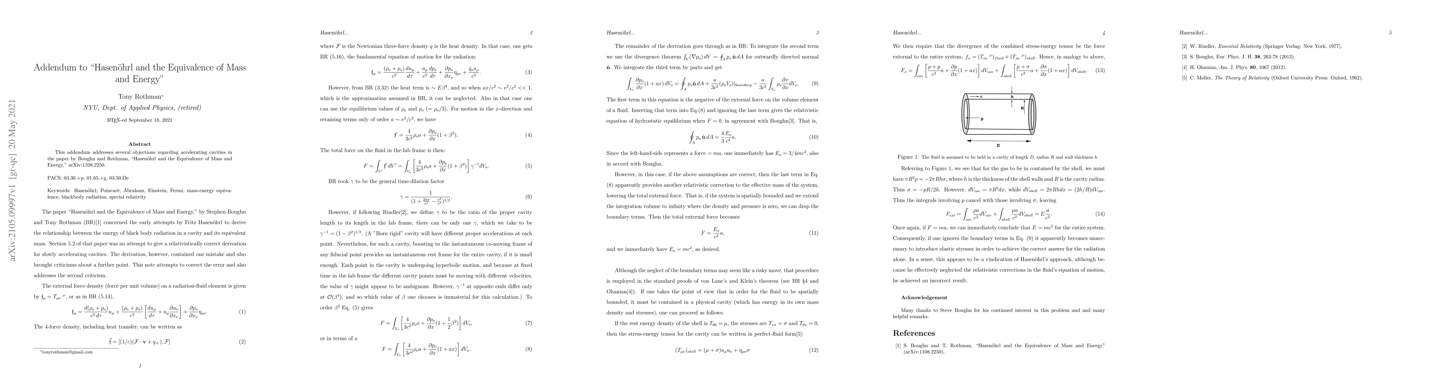 This addendum responds to critiques of the accelerating cavity model in Boughn and Rothman's paper on Hasenöhrl's treatment of mass-energy equivalence, aiming to clarify and address the raised objections.