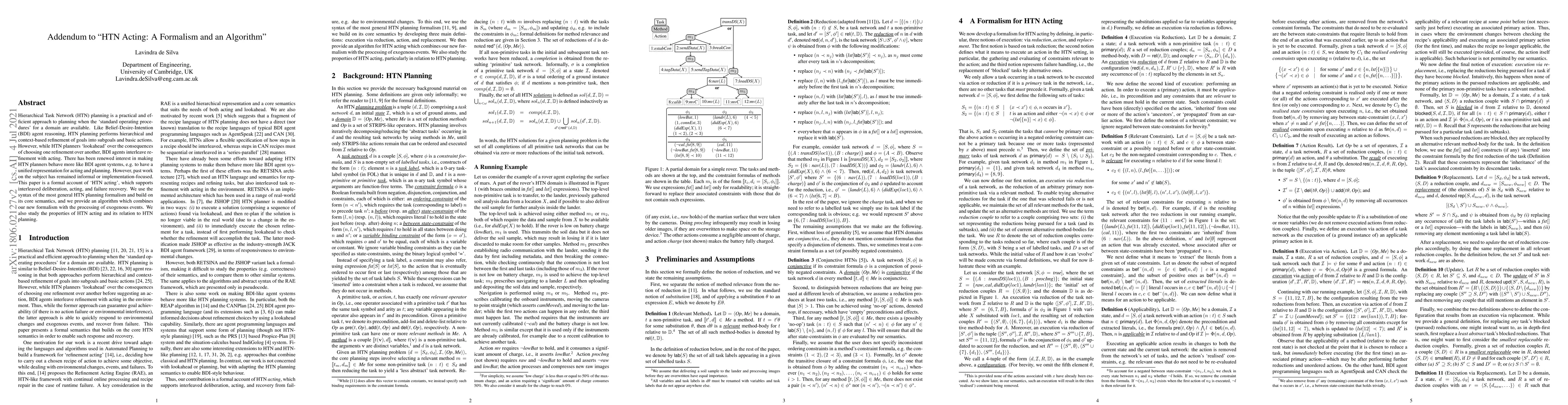 This paper formalizes 'HTN acting' to enable interleaved deliberation, acting, and failure recovery in HTN planning, extending its core semantics. It introduces an algorithm that integrates this formalism with exogenous event processing and examines the properties and relationship between HTN acting and traditional HTN planning.