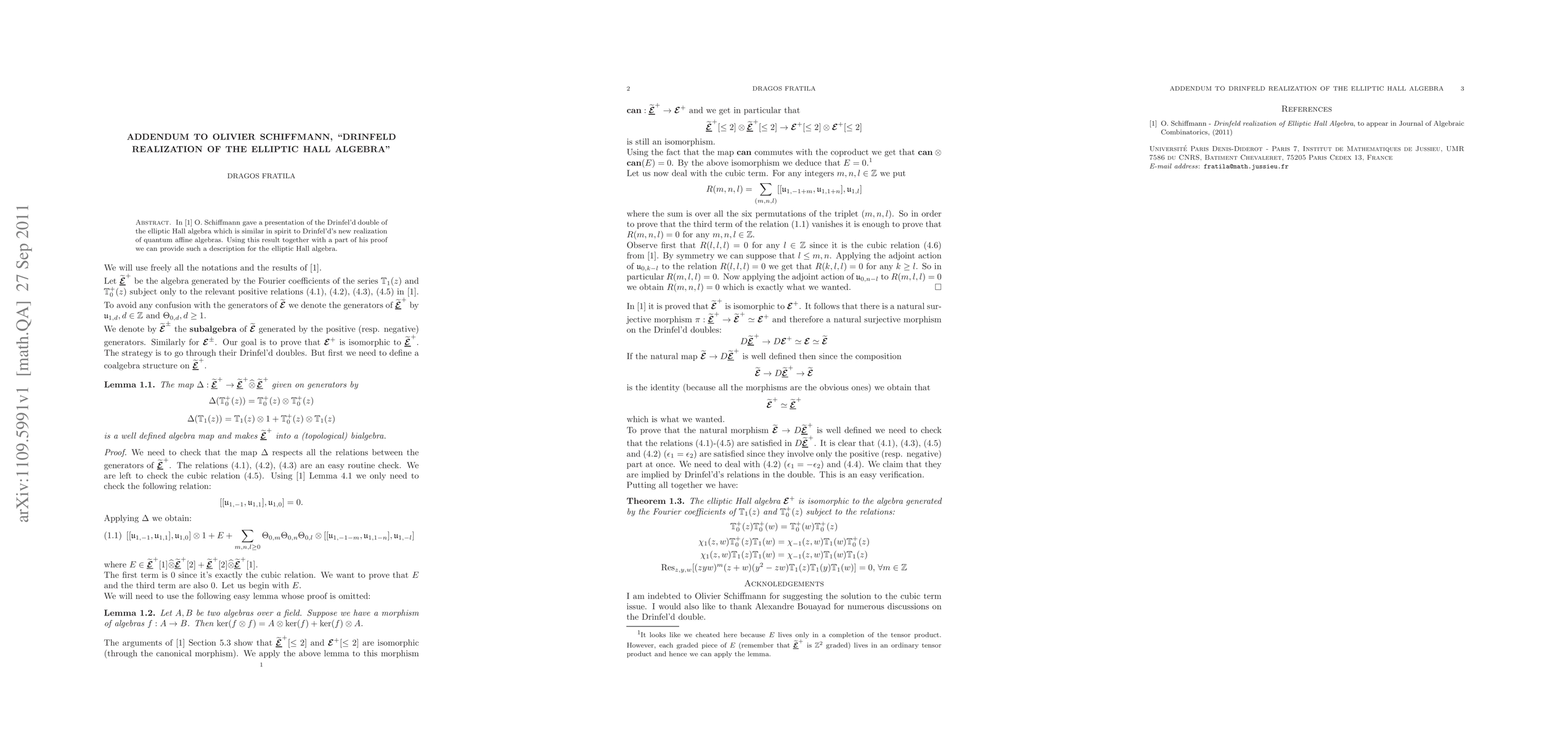 This addendum extends Olivier Schiffmann's work on the Drinfel'd double of the elliptic Hall algebra, providing a new realization of the elliptic Hall algebra akin to Drinfel'd's approach for quantum affine algebras using part of Schiffmann's original proof.