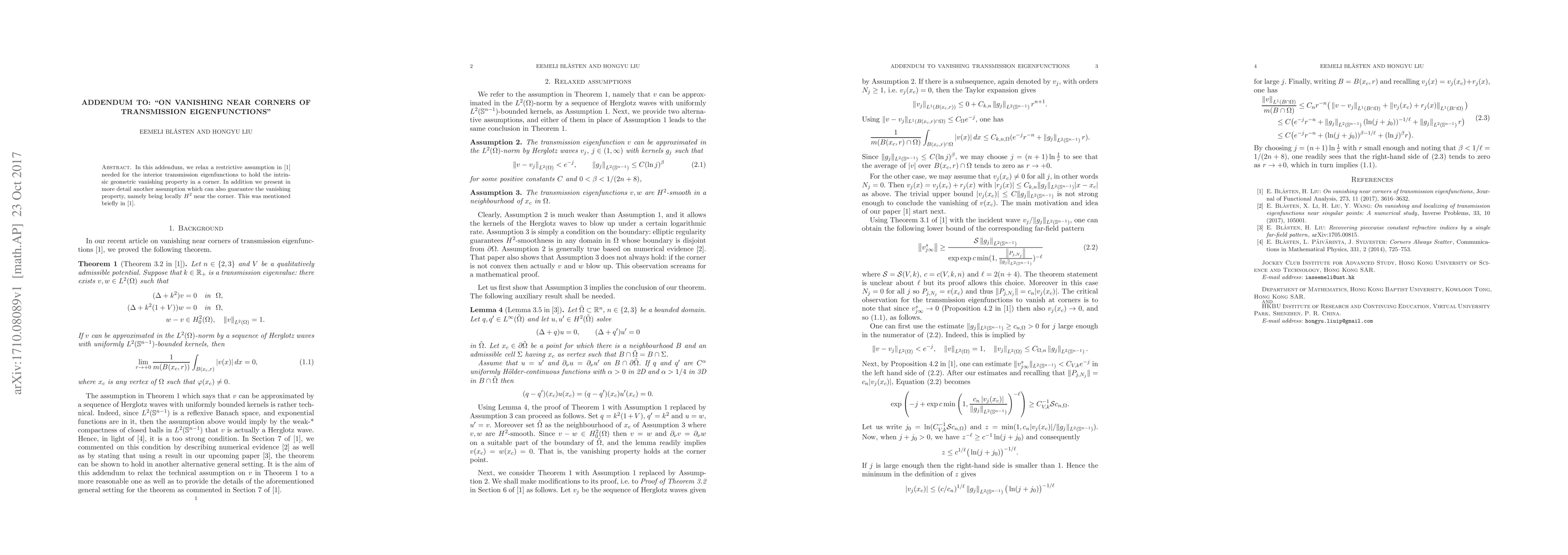 In this addendum, we relax a restrictive assumption in [1] needed for the interior transmission eigenfunctions to hold the intrinsic geometric vanishing property in a corner. In addition we present in more detail another assumption which can also guarantee the vanishing property, namely being locally $H^2$ near the corner. This was mentioned briefly in [1].