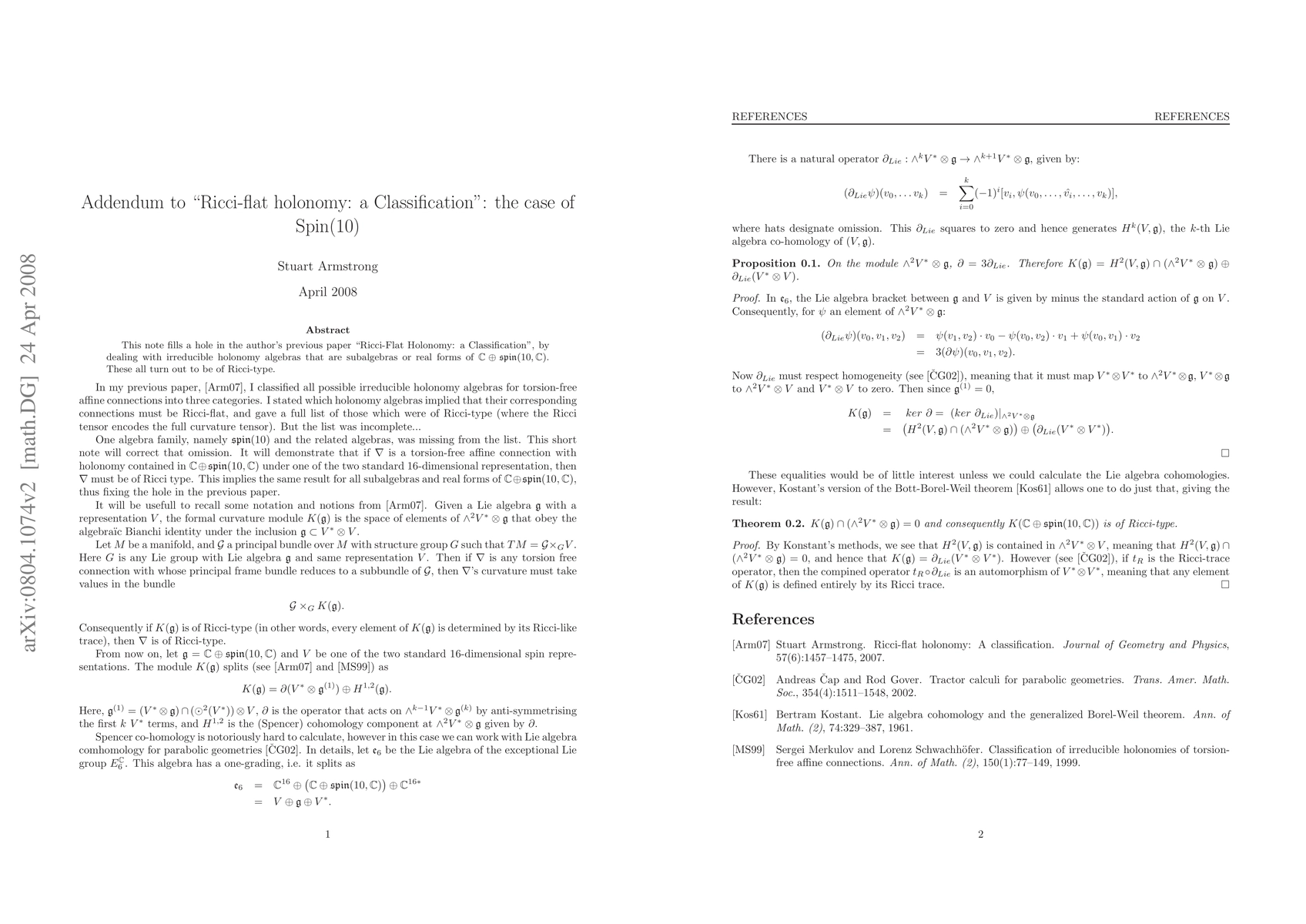 This note fills a hole in the author's previous paper ``Ricci-Flat Holonomy: a Classification'', by dealing with irreducible holonomy algebras that are subalgebras or real forms of $\mbb{C} \oplus \mf{spin}(10,\mbb{C})$. These all turn out to be of Ricci-type.