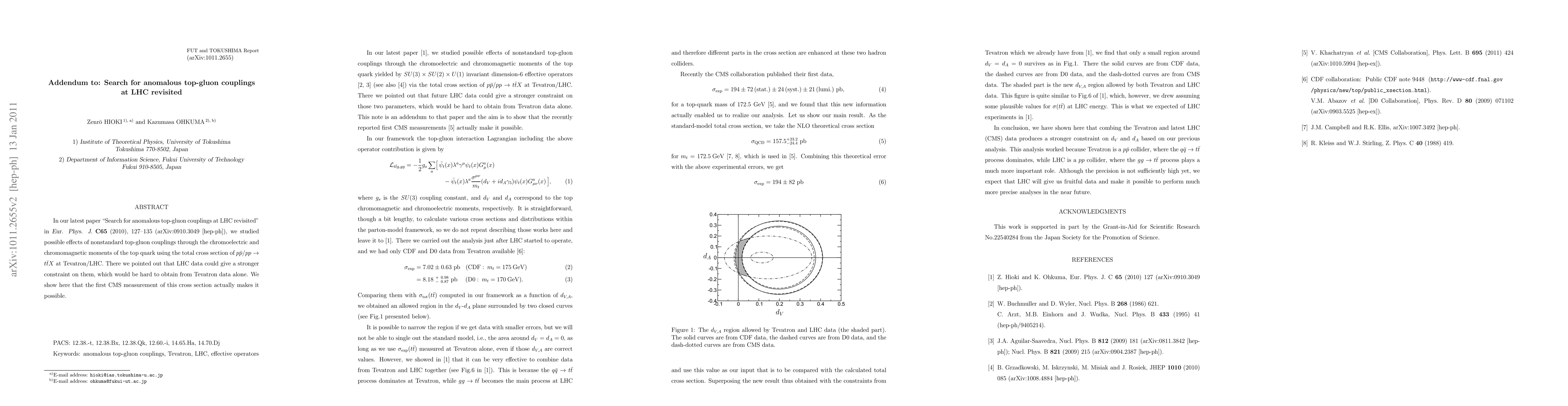 In our latest paper "Search for anomalous top-gluon couplings at LHC revisited" in Eur. Phys. J. C65 (2010), 127-135 (arXiv:0910.3049 [hep-ph]), we studied possible effects of nonstandard top-gluon couplings through the chromoelectric and chromomagnetic moments of the top quark using the total cross section of ppbar/pp --> ttbar X at Tevatron/LHC. There we pointed out that LHC data could give a stronger constraint on those two parameters, which would be hard to obtain from Tevatron data alone. We show here the first CMS measurement of this cross section actually makes it possible.