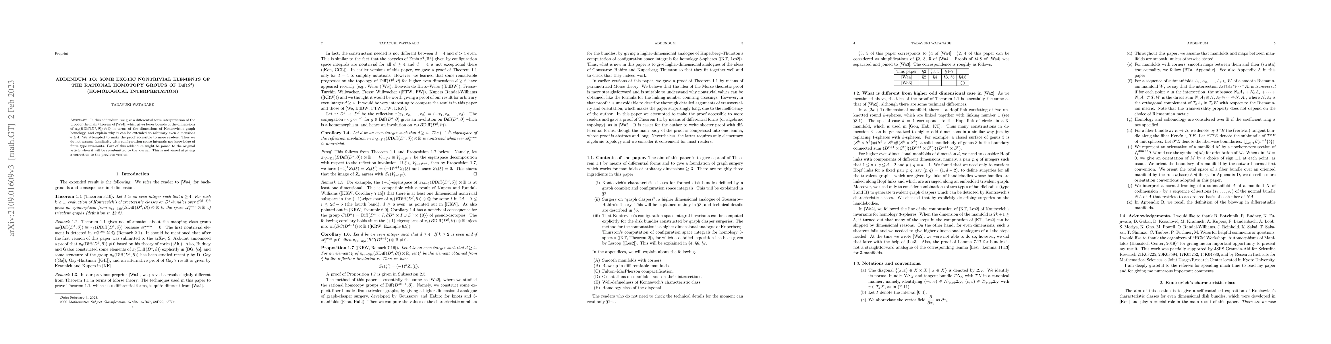 In this addendum, we give a differential form interpretation of the proof of the main theorem of arXiv:1812.02448, which gives lower bounds of the dimensions of $\pi_k(B\mathrm{Diff}(D^4,\partial))\otimes\mathbb{Q}$ in terms of the dimensions of Kontsevich's graph homology, and explain why it can be extended to arbitrary even dimensions $d\geq 4$. We attempted to make the proof accessible to more readers. Thus we do not assume familiarity with configuration space integrals nor knowledge of finite type invariants. Part of this addendum might be joined to the original article when it will be re-submitted to the journal. This is not aimed at giving a correction to the previous version.