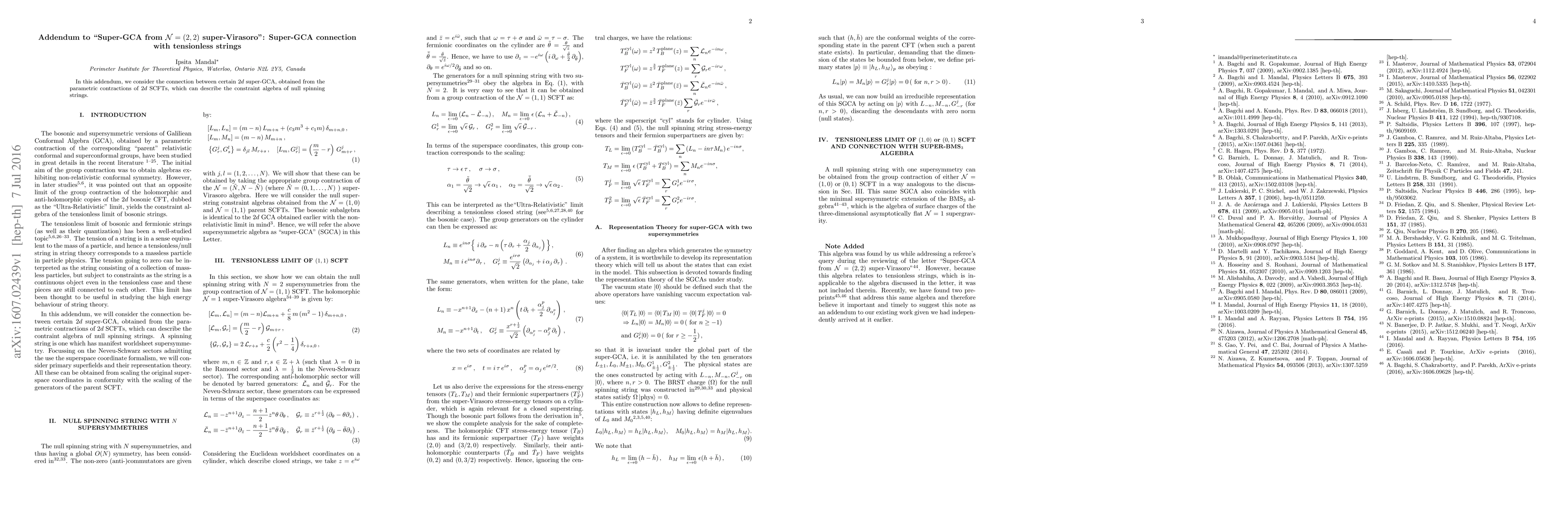 In this addendum, we consider the connection between certain $2d$ super-GCA, obtained from the parametric contractions of $2d$ SCFTs, which can describe the constraint algebra of null spinning strings.