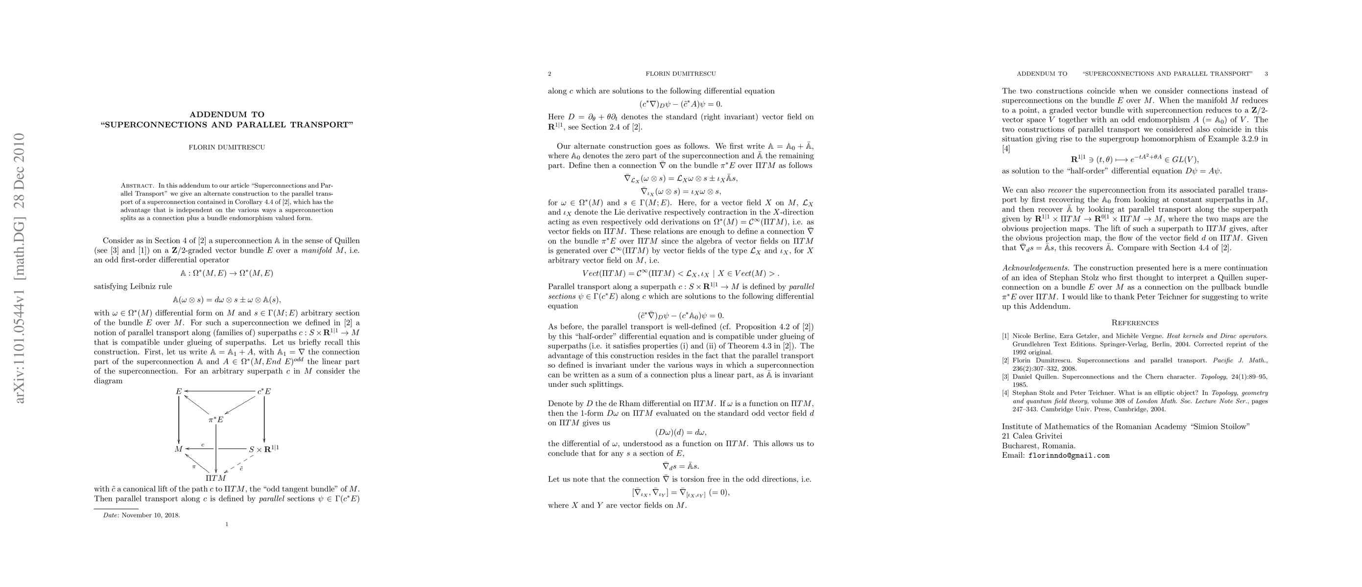 This addendum presents an alternative construction for the parallel transport of a superconnection, independent of how it splits into a connection and a bundle endomorphism valued form, improving upon the method in Corollary 4.4 of the referenced article.